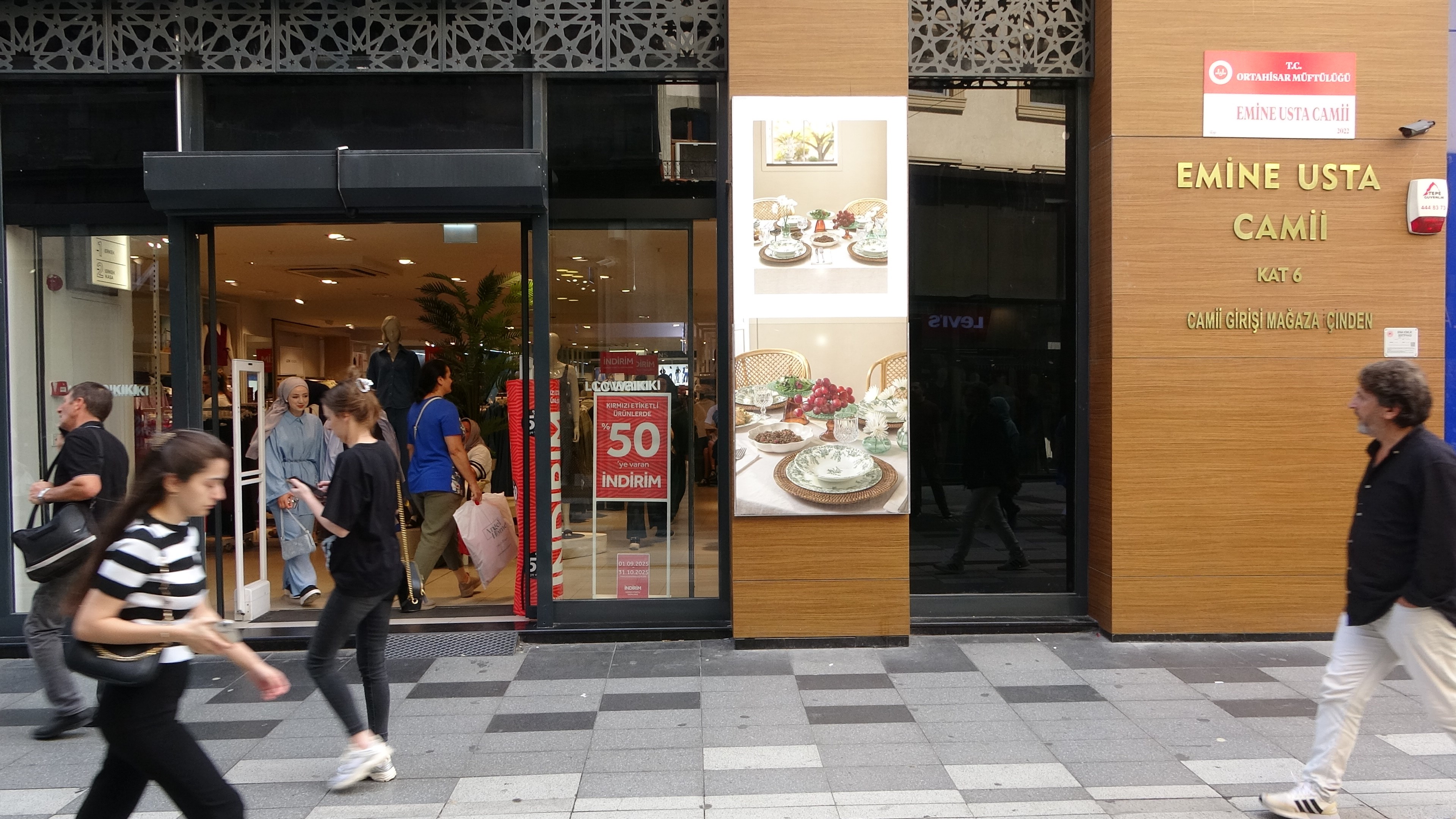 Trabzon'un en işlek noktalarından biri olan Uzun Sokak'ta sıra dışı bir mimari projeyle inşa edilen cami, hem hayırseverliği hem de ilginç konumuyla dikkat çekiyor. Altı kattan oluşan binanın en üst katı cami olarak hizmet verirken cami, hayırsever iş insanları Mustafa Usta ve İbrahim Usta kardeşler tarafından anneleri Emine Usta adına yaptırıldı. Camiyi farklı kılan durum ise camiye gidebilmek için giyim mağazası içinde bulunan asansörünü kullanarak ulaşılabilir olması.