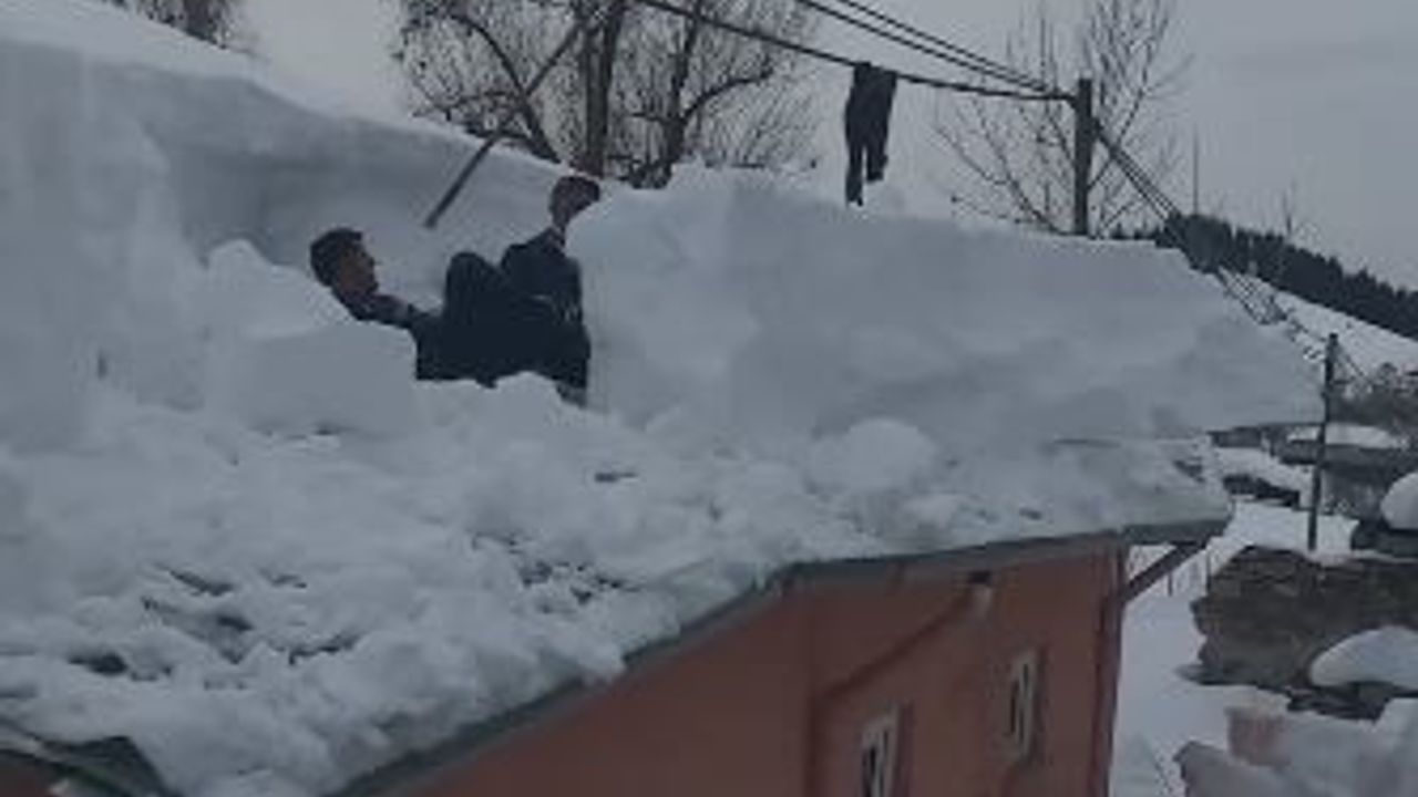 Artvin’in Şavşat ilçesinde köy okulunun çatısında biriken kar kütlelerini temizleyen iki arkadaşın eğlenceli halleri gülümsetti.