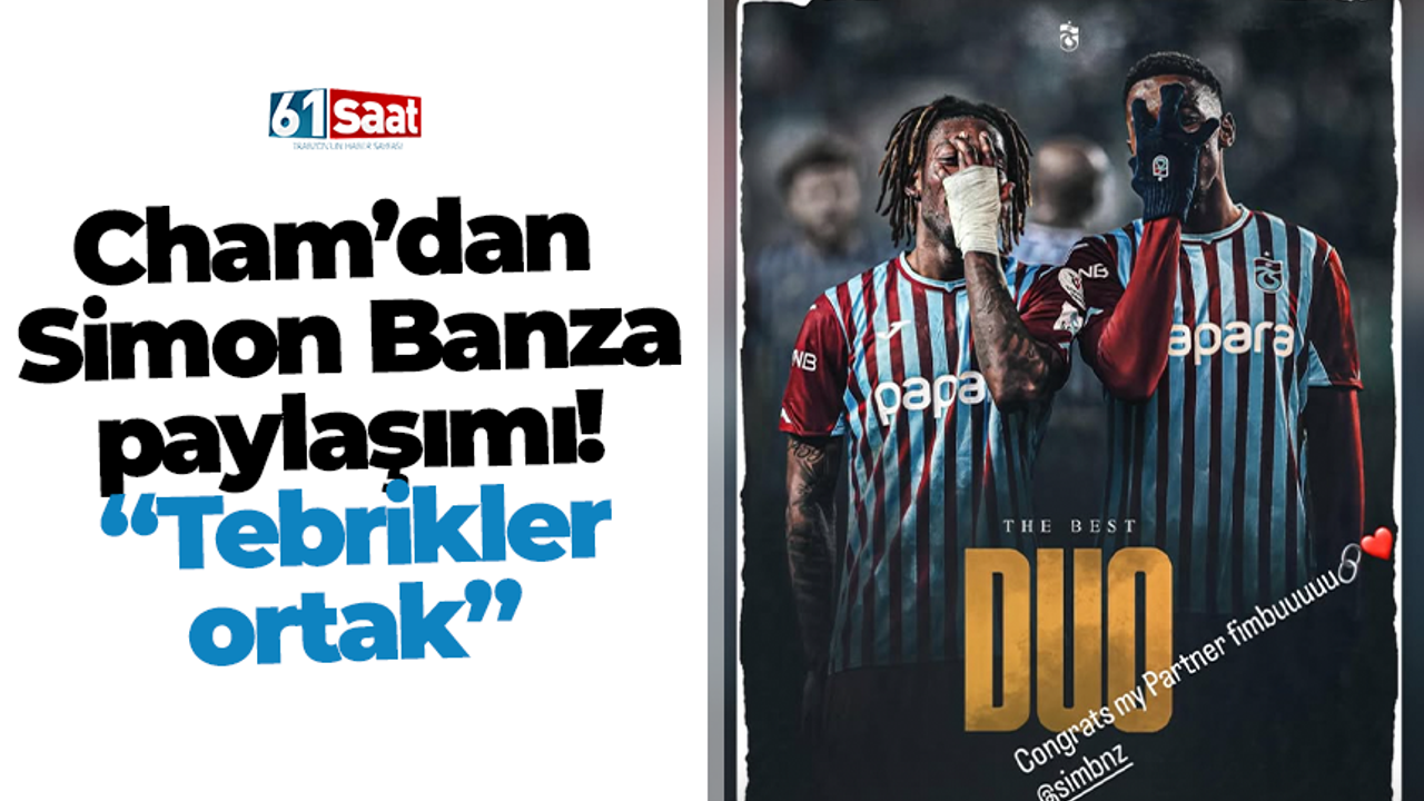 Trabzonspor’un kiralık oyuncusu Cham da, Trabzonspor’da birlikte forma giydiği eski takım arkadaşı Simon Banza’yı, Trabzonspor’un eski bir paylaşımını alıntılayarak “Best duo” ve “Tebrikler ortak” ifadeleriyle tebrik etti.