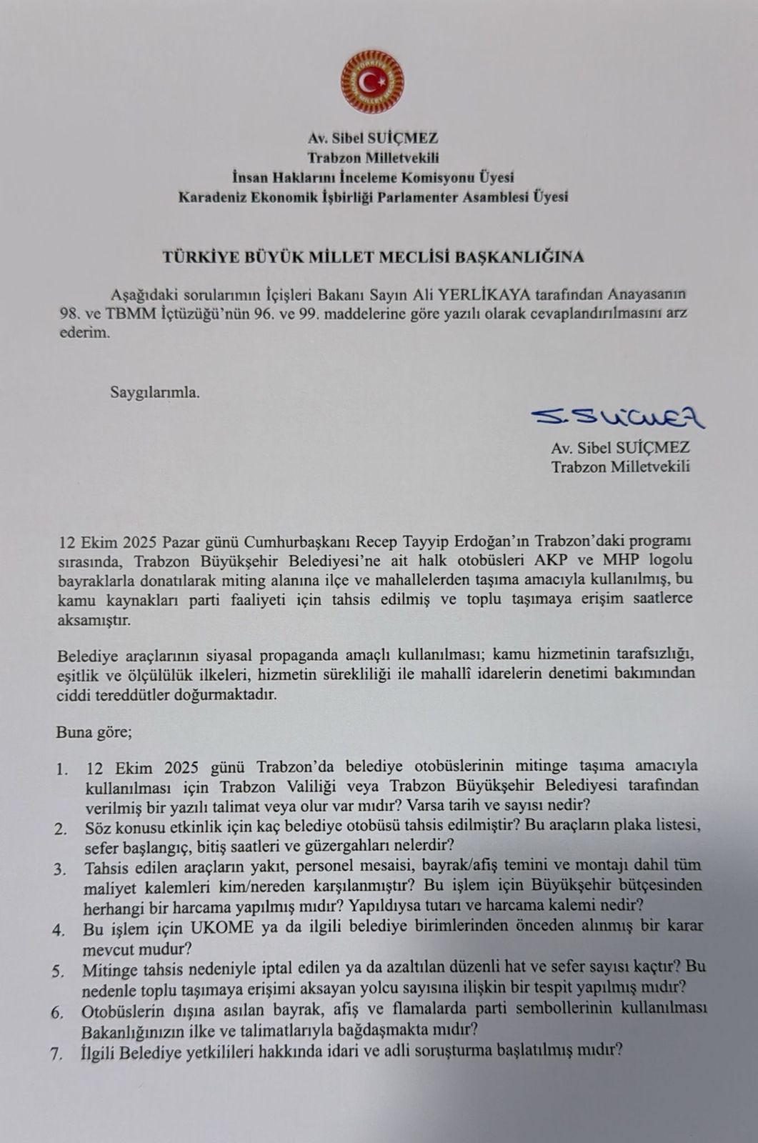 “12 Ekim 2025 Pazar günü Cumhurbaşkanı Recep Tayyip Erdoğan’ın Trabzon’daki programı sırasında, Trabzon Büyükşehir Belediyesi’ne ait halk otobüsleri AKP ve MHP logolu bayraklarla donatılarak miting alanına ilçe ve mahallelerden taşıma amacıyla kullanılmış, bu kamu kaynakları parti faaliyeti için tahsis edilmiş ve toplu taşımaya erişim saatlerce aksamıştır.