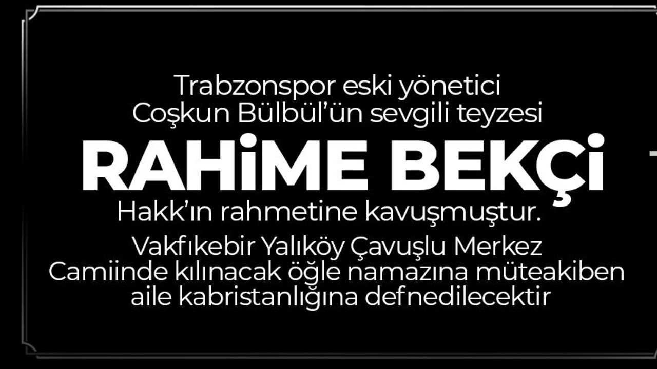 Trabzonspor eski yöneticisi iş insanı Coşkun Bülbül’ün teyzesi Rahime Bekçi Hakkın rahmetine kavuştu. Uzun süredir hastalığı nedeniyle İstanbul’da tedavi gören Rahime Bekçi, dün tedavi gördüğü hastanede yaşamını yitirdi.