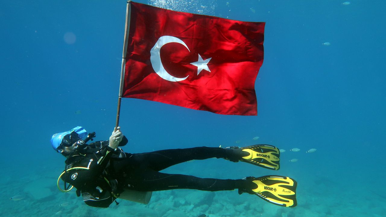 Muğla'nın Fethiye ilçesinde dalgıçlar 30 Ağustos Zafer Bayramı dolayısıyla deniz dibinde Türk bayrağı açtı.