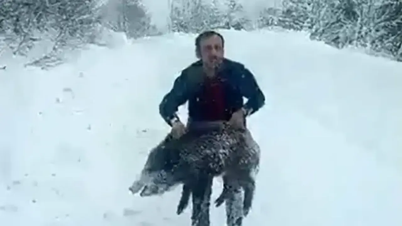 Sinop'un Erfelek ilçesinde karlı yolda karşılaştığı yaban domuzu sürüsünden bir yavruyu eliyle yakalayan vatandaşa ceza kesildi.