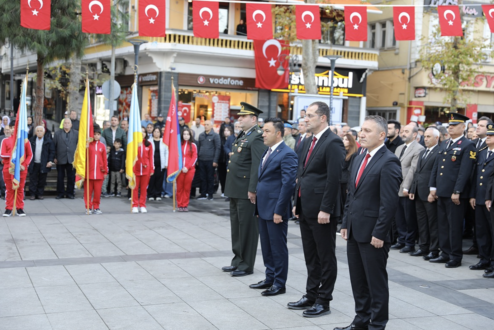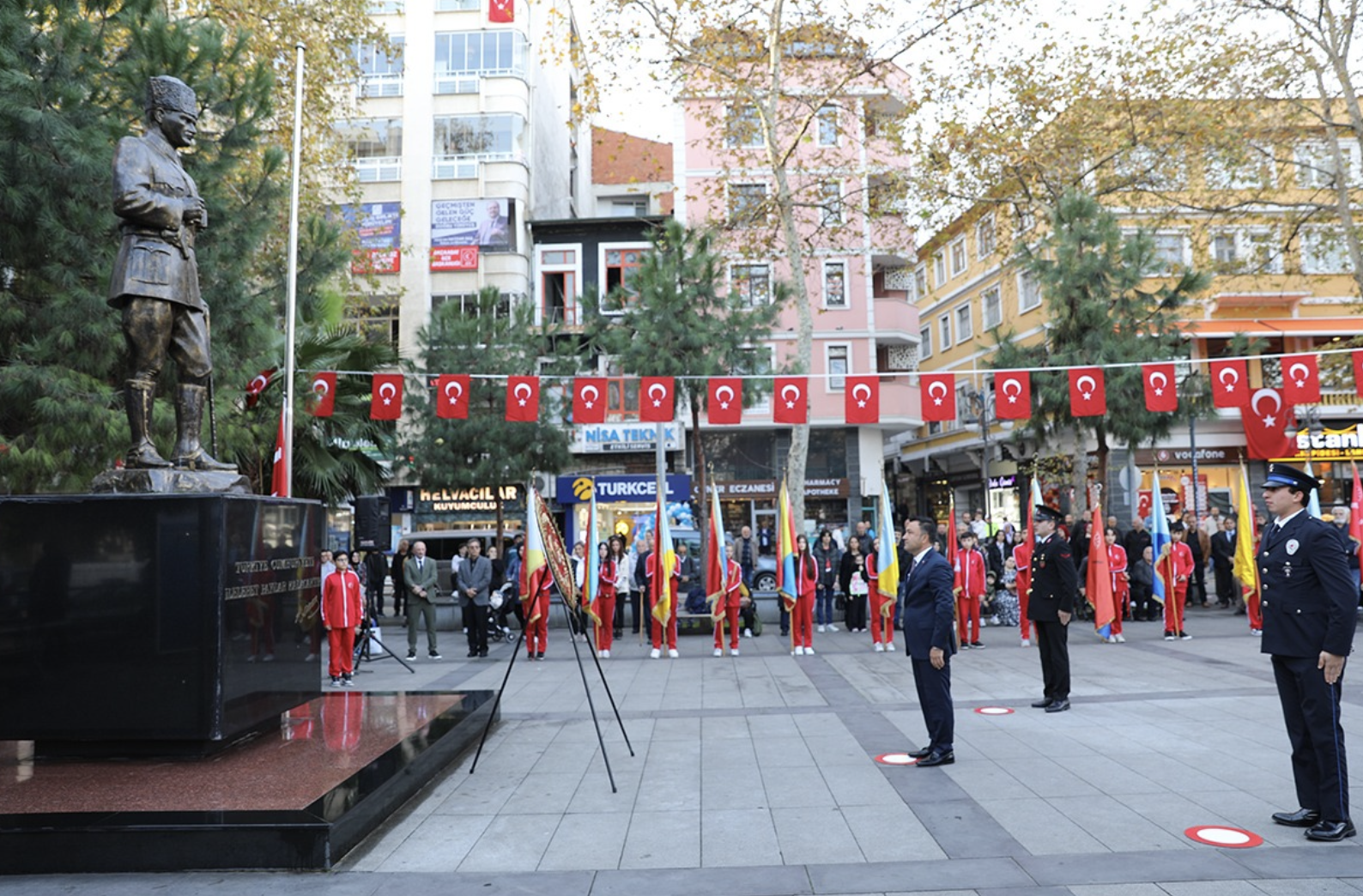 Tören, Atatürk Anıtı’na çelenk sunulmasıyla başladı. Saat 09.05’te sirenler eşliğinde iki dakikalık saygı duruşunda bulunuldu, ardından İstiklâl Marşı okundu.