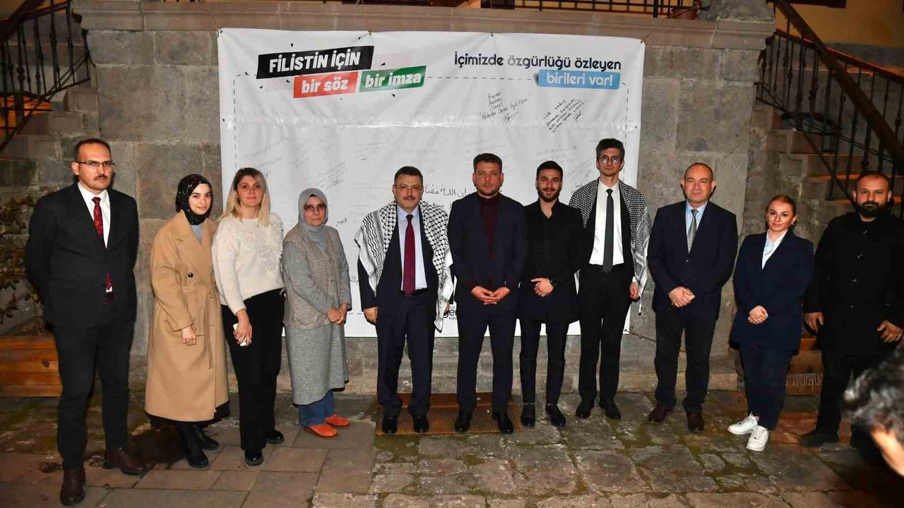 Etkinliğin son bölümünde Genç, kütüphanenin girişine asılan “Filistin için bir söz, bir imza” görseline, Tevbe Suresi’nin “Korkma, çekinme Allah bizimledir” manasına gelen 40. ayetini yazarak, imzaladı.