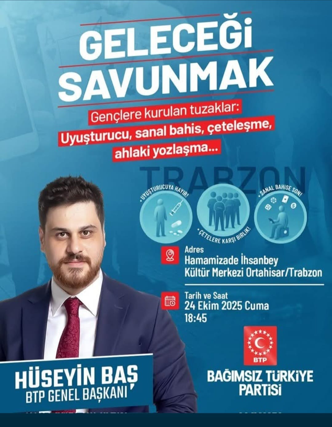 Trabzon’da gençleri hedef alan toplumsal tehditlere karşı farkındalık oluşturmak amacıyla düzenlenen “Geleceği Savunmak” programı, 24 Ekim Cuma günü saat 18.45’te Hamamizade İhsanbey Kültür Merkezi’nde gerçekleştirilecek. Etkinlikte, uyuşturucu, sanal bahis, çeteleşme ve ahlaki yozlaşma gibi konular ele alınacak.