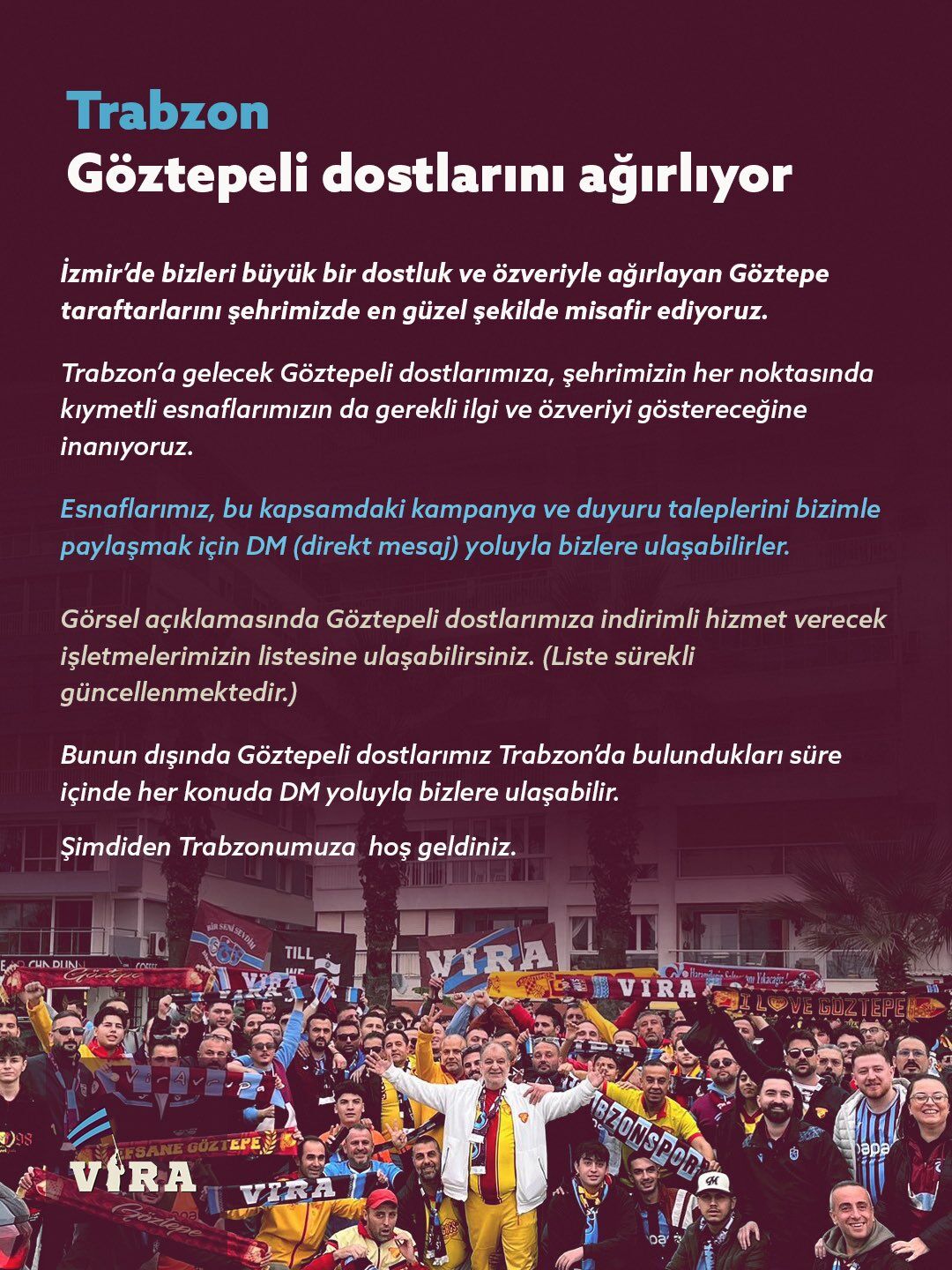 Yapılan açıklamada, "İzmir’de bizleri büyük bir dostluk ve özveriyle ağırlayan Göztepe taraftarlarını şehrimizde en güzel şekilde misafir ediyoruz… Göztepeli dostlarımıza şehrimizin her noktasında kıymetli işletmelerimizin, esnaflarımızın da gerekli ilgi ve misafirperverliğimizi göstereceğine inanıyoruz.