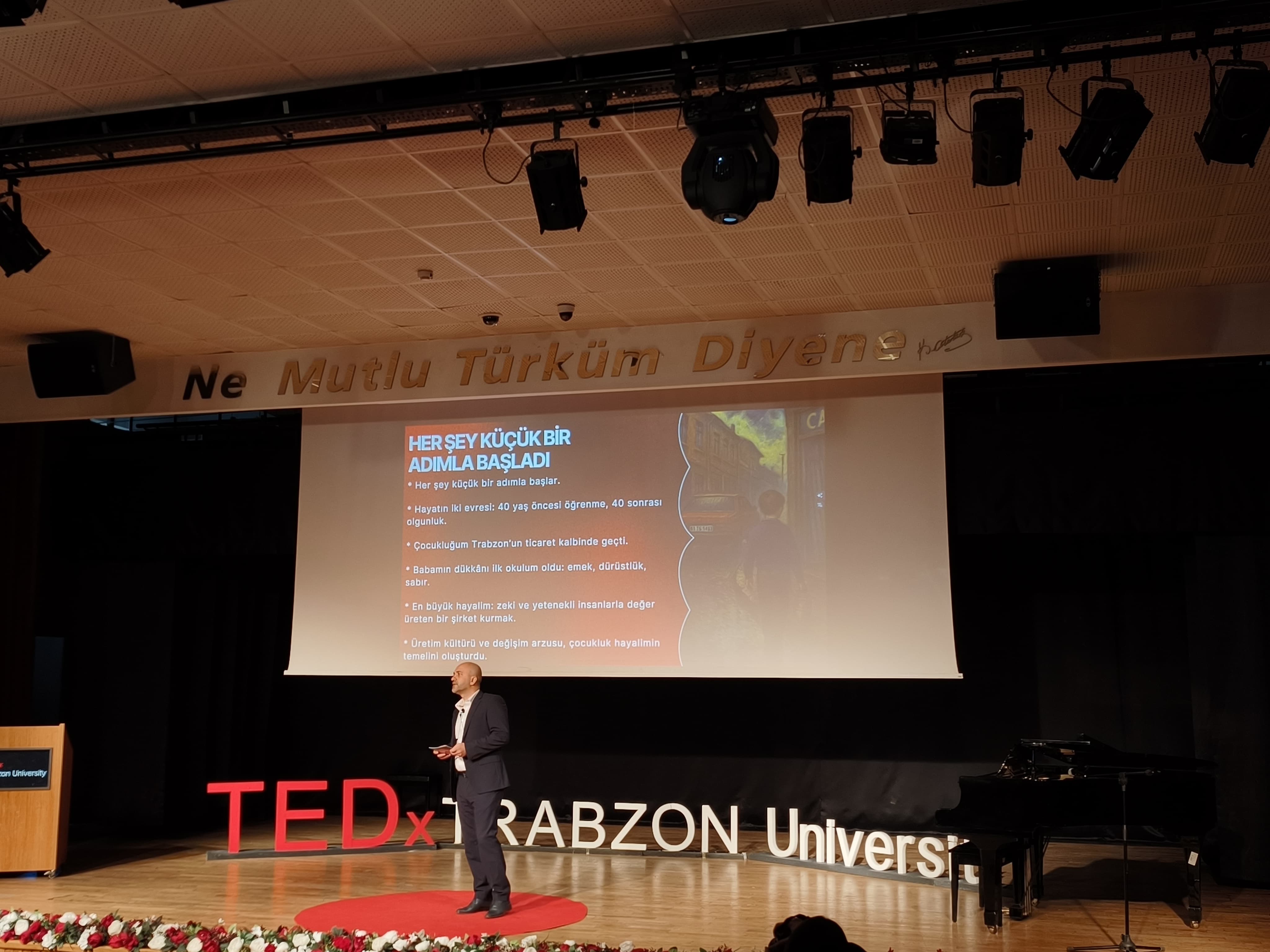 Ali Haydar Baş, konuşmasına çocukluk yıllarından başlayarak hayatının iki evresini gençlerle paylaştı. Trabzon’da sanayi ve ticaretin kalbi sayılan bir mahallede başlayan hikâyesinde, ilk ilkokulunun babasının küçük dükkanı olduğunu dile getirdi. O yıllarda dürüstlük, emek ve sabırla tanıştığını belirten Baş, “Küçükken kurduğum en büyük hayal, bir şirket sahibi olmaktı. Bu hayal, zamanla üretim kültürüne ve değişim arzusuna dönüştü,” ifadelerini kullandı.