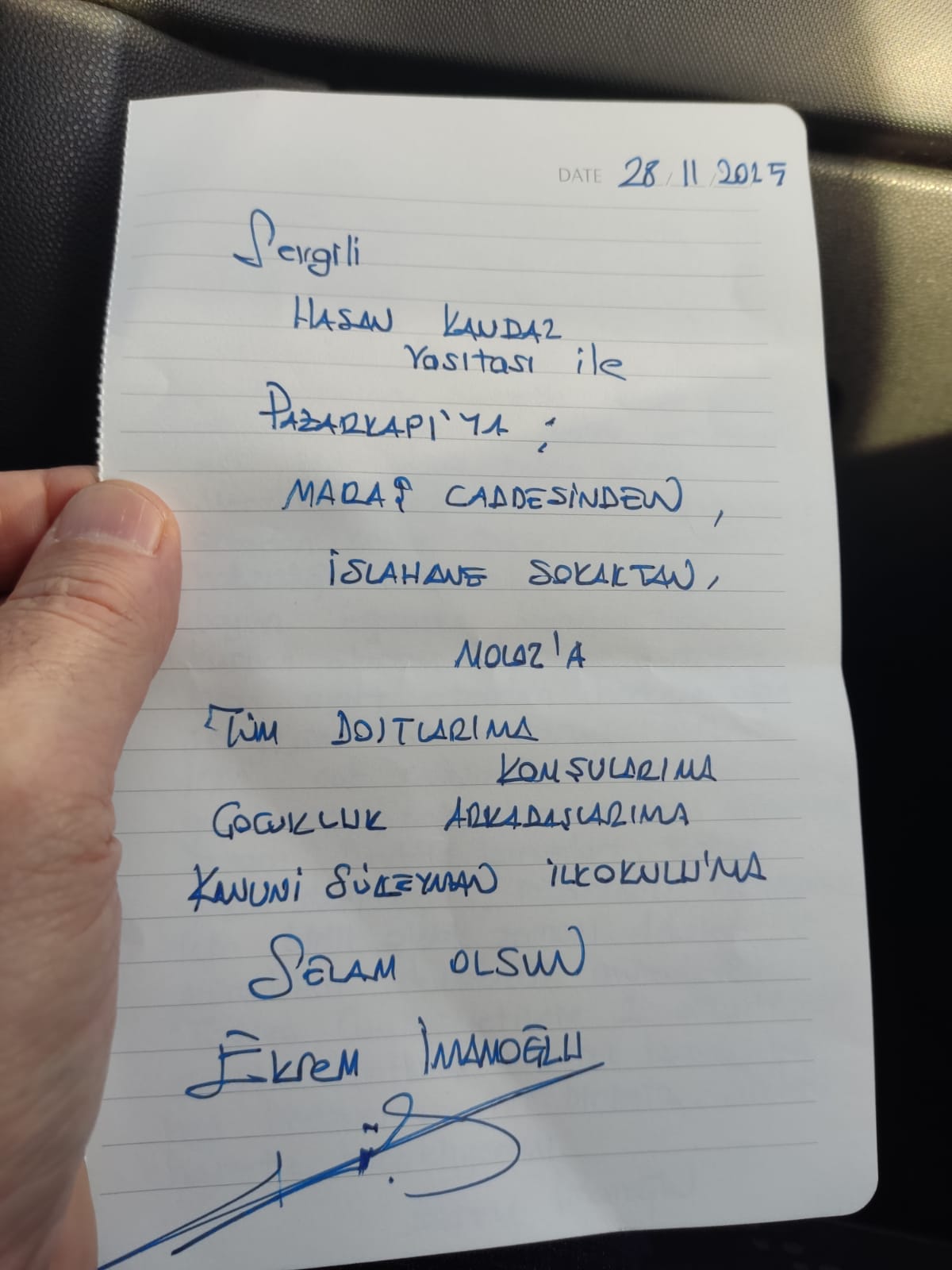 İmamoğlu’nun notunda, “Sevgili Hasan Kandaz vasıtası ile Pazarkapı’ya, Maraş Caddesi’nden, İslahane sokaktan, Moloz’a tüm dostlarıma, komşularıma, çocukluk arkadaşlarıma, Kanuni Süleyman İlkokulu’na selam olsun.” İfadeleri kullanıldı.
