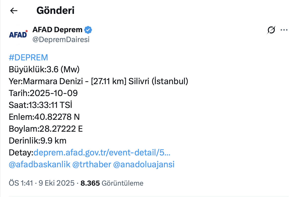 Marmara Denizi Silivri açıklarında derinliği 9.9 KM olan 3.6 büyüklüğünde bir deprem meydana geldi. Ayrıntılar geliyor...