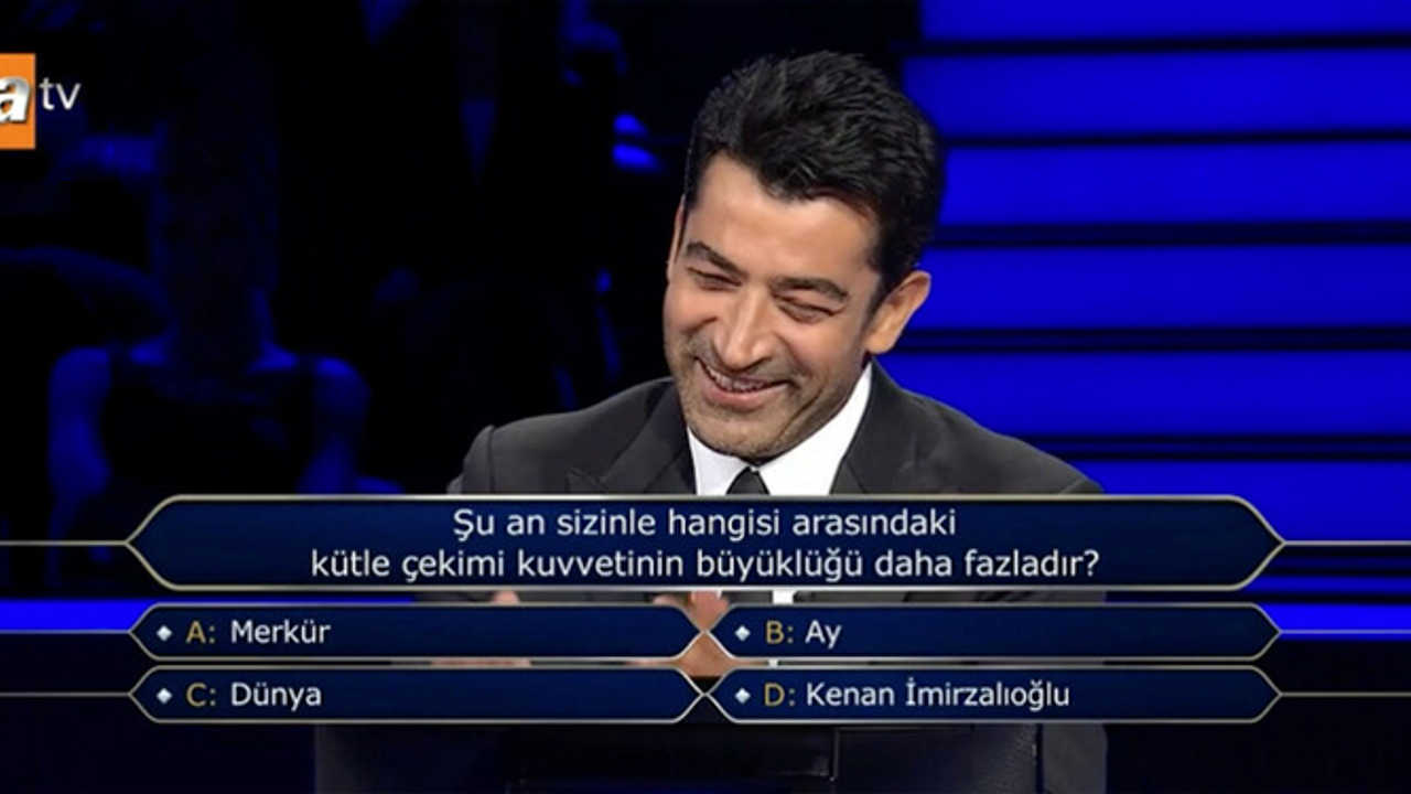 Yarışmacı, ikinci baraj sorusunda ilginç bir an yaşadı. "Şu an sizinle hangisi arasındaki kütle çekimi kuvvetinin büyüklüğü daha fazladır?" sorusuyla hem Kenan İmirzalıoğlu hem de yarışmacı keyifli bir şekilde şaşırdı ve güldü. Şıkları incelediklerinde, Kenan İmirzalıoğlu'nun adının da aralarında yer aldığını görünce şaşkınlıkları daha da arttı.