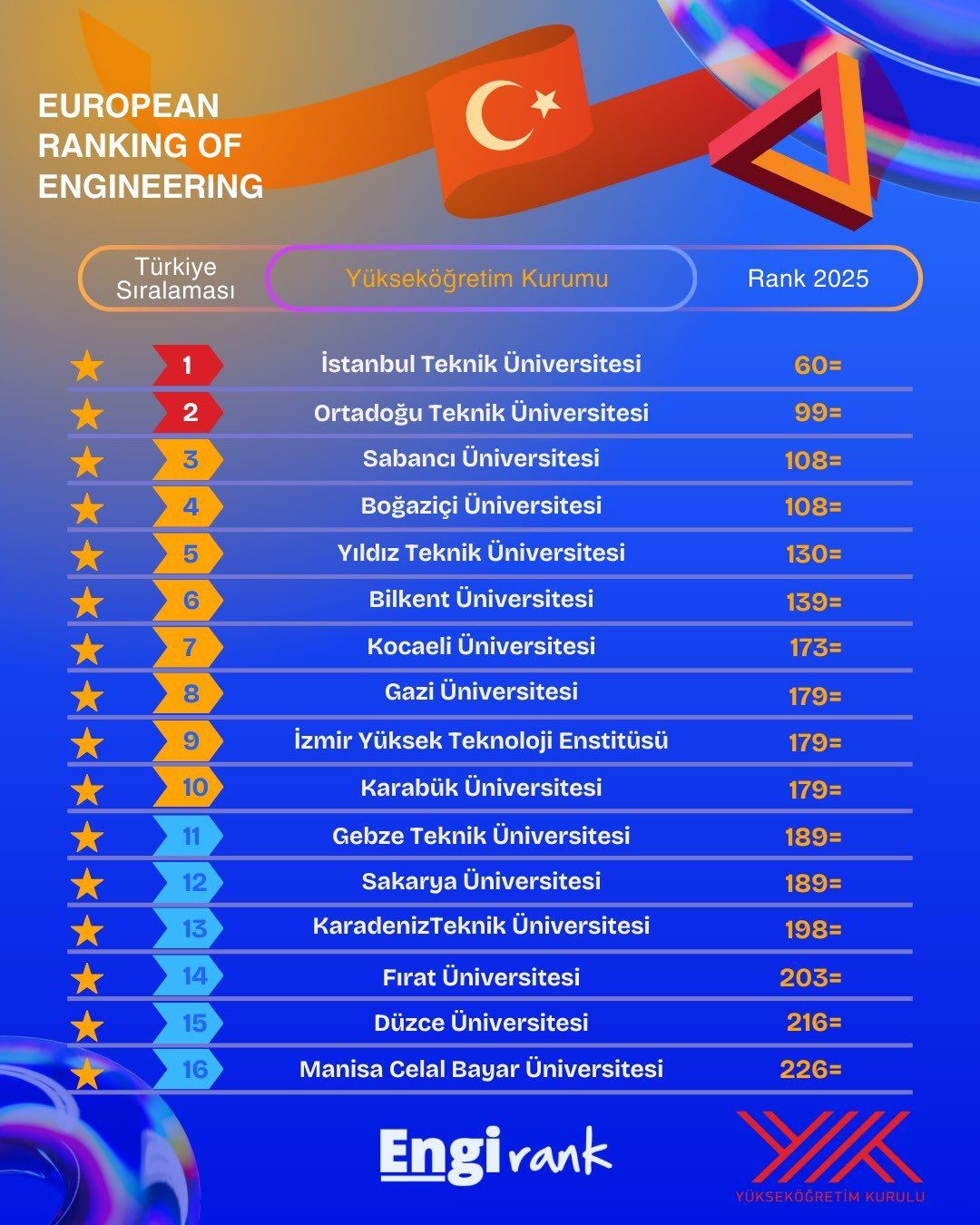 EngiRank, 2020-2024 yılları arasındaki son 4 yıla ait performans göstergelerini temel alarak Avrupa Yükseköğretim Alanı’nda yer alan 36 ülkeden 300 yükseköğretim kurumunu değerlendirdi. Avrupa Komisyonu tarafından önemle takip edilen sıralama; akademik yayınlar, atıflar, Avrupa Araştırma Konseyi projelerine katılım, Erasmus+ ve Horizon Europe faaliyetleri, mühendislik akreditasyonları, patent çıktıları, sanayi iş birlikleri ve Birleşmiş Milletler Sürdürülebilir Kalkınma Hedeflerine katkı gibi çok boyutlu kriterlere dayanıyor. Türkiye’den toplam 16 üniversite listeye girmeyi başardı.