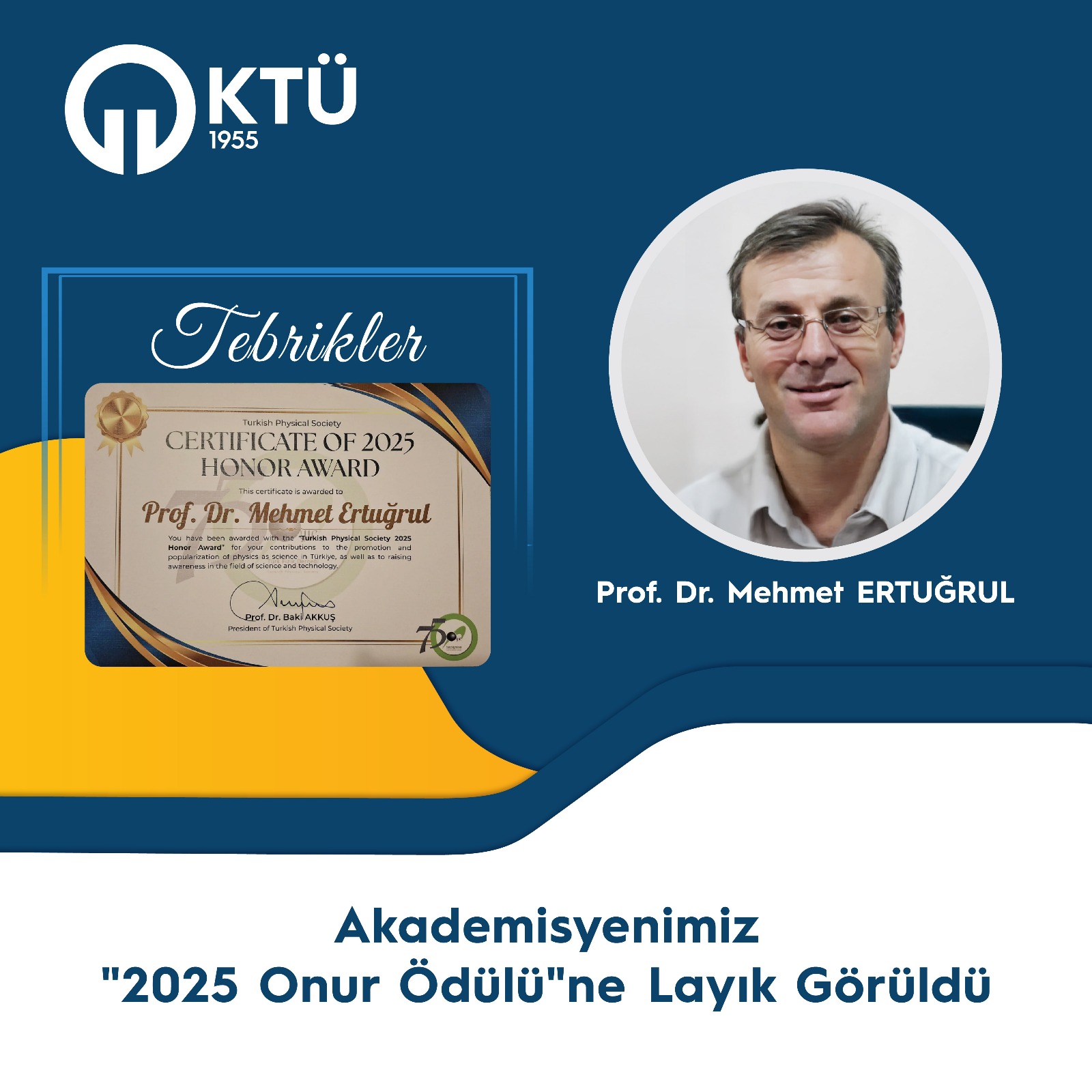 Karadeniz Teknik Üniversitesi (KTÜ) Mühendislik Fakültesi Metalurji ve Malzeme Mühendisliği Bölümü Öğr. Üyesi Prof. Dr. Mehmet Ertuğrul, fiziğin Türkiye’de bilim olarak tanıtılması ve yaygınlaştırılmasına, ayrıca bilim ve teknoloji alanında farkındalığın artırılmasına yaptığı katkılardan dolayı Türk Fizik Derneği tarafından “2025 Onur Ödülü”nelayık görüldü.
