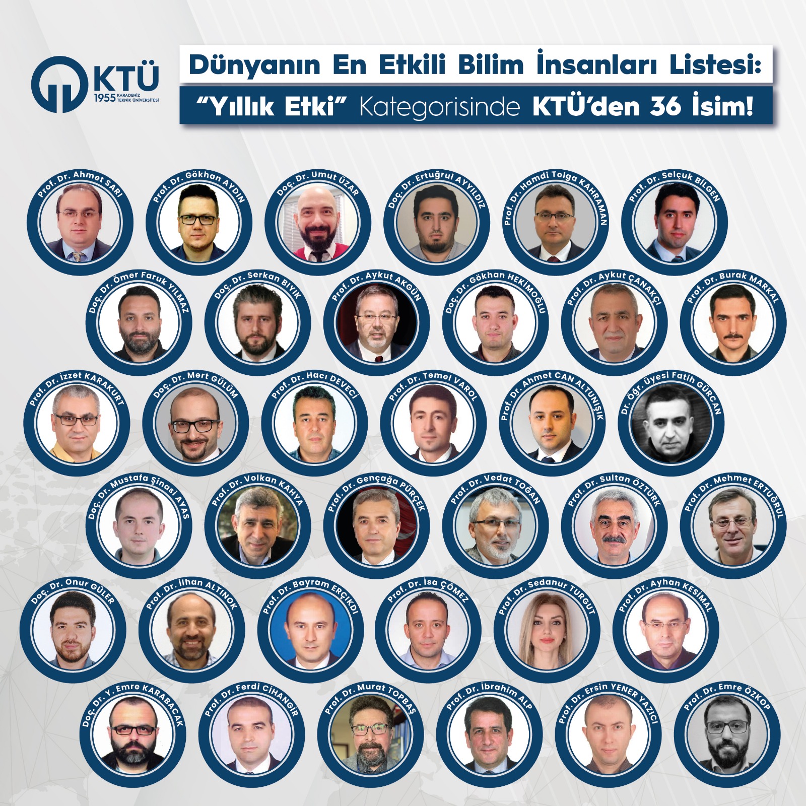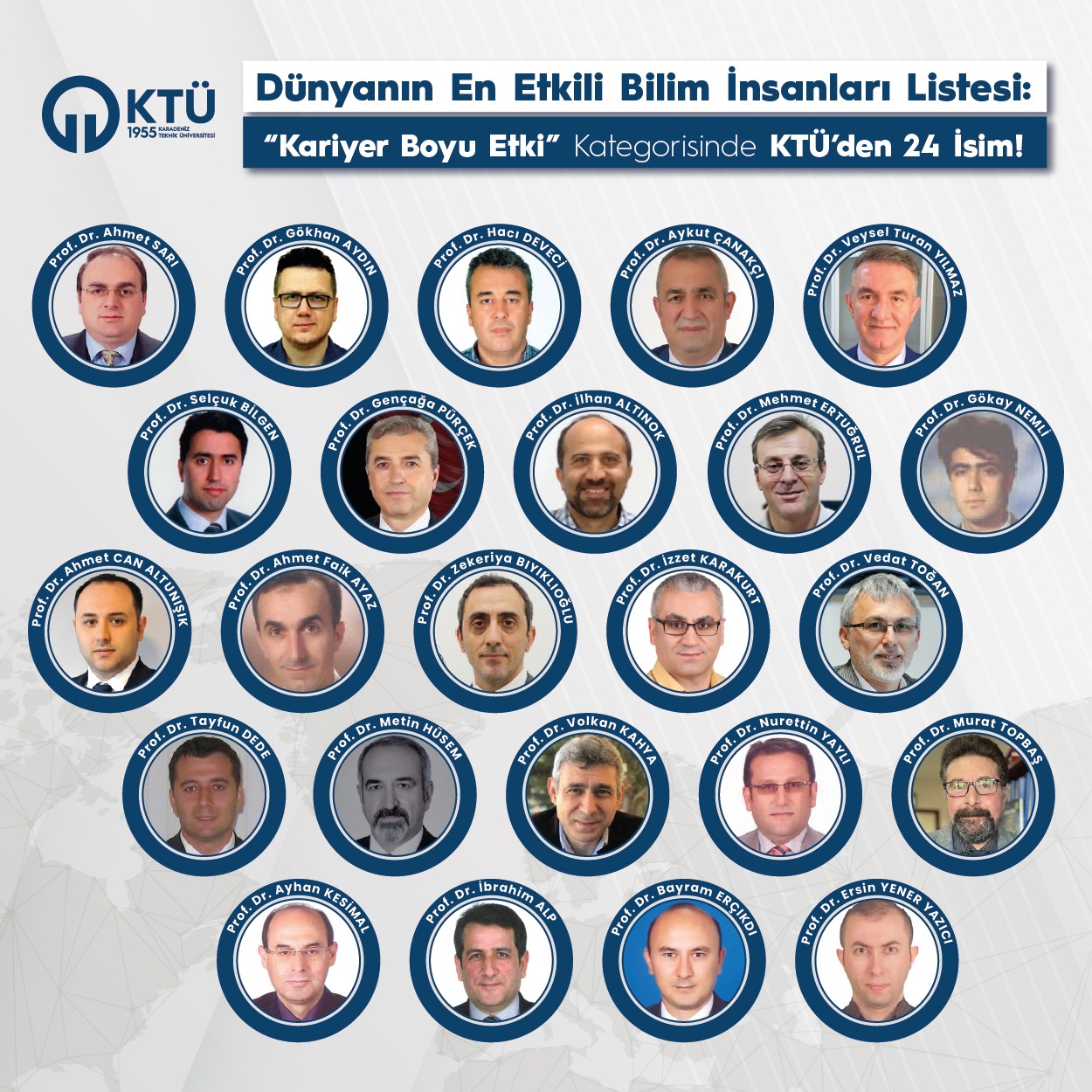 Kariyer Boyu Etki Kategorisi’nde, KTÜ’den 24 akademisyen listede yer aldı. Akademisyenlerin fakülte ve birimlere göre dağılımı ise şu şekilde oldu: 16 akademisyen/Mühendislik Fakültesi, 4 akademisyen/Fen Fakültesi, 1 akademisyen/Sürmene Deniz Bilimleri Fakültesi, 1 akademisyen/Orman Fakültesi, 1 akademisyen/Eczacılık Fakültesi, 1 akademisyen/Tıp Fakültesi.