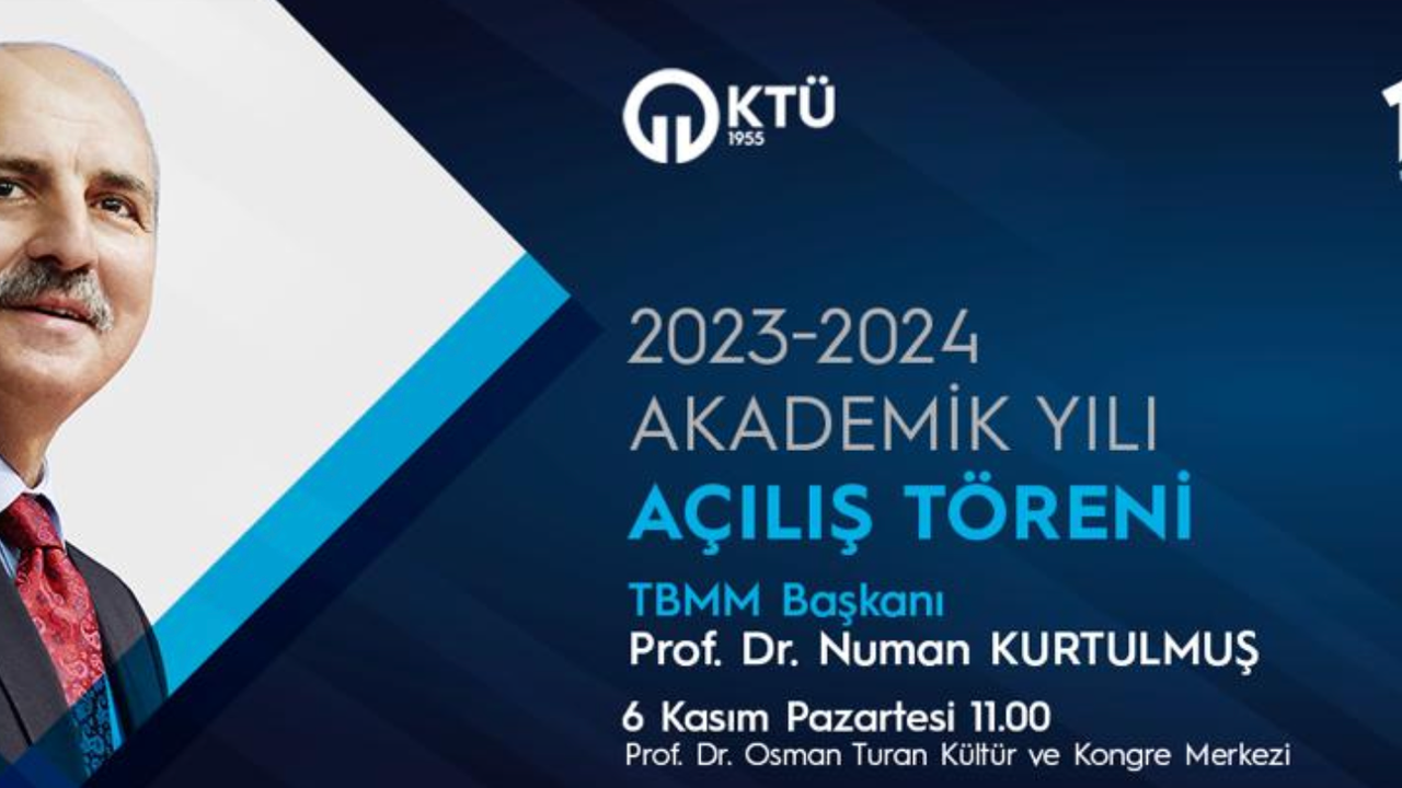 Karadeniz Teknik Üniversitesi 2023-2024 Akademik Yıl Açılış töreni, Türkiye Büyük Millet Meclisi Başkanı (TBMM) Prof. Dr. Numan Kurtulmuş’un katılımı ile gerçekleştirilecek. KTÜ Osman Turan Kültür ve Kongre Merkezi’nde 6 Kasım 2023 saat: 11.00’de başlayacak olan ve 61’inci Akademik Yıl olma özelliğini taşıyan tören öncesi KTÜ’den yapılan açıklamada, “2023 - 2024 Akademik Yılı Açılış Töreni, Türkiye Büyük Millet Meclisi Başkanı Sayın Prof. Dr. Numan Kurtulmuş’un teşrifleriyle gerçekleştirilecektir. Üniversitemiz için yeni bir dönemin başlangıcı olacak olan bu anlamlı günde, TBMM Başkanı Prof. Dr. Sayın Numan Kurtulmuş’u ağırlamaktan mutluluk duyacağız” denildi.