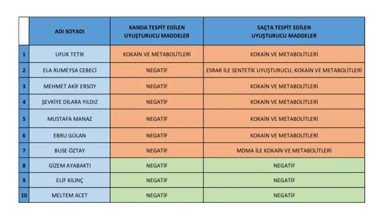 Yürütülen soruşturmada kapsamında uyuşturucu testine tabi tutulan isimlerle ilgili sonuçlar çıktı.