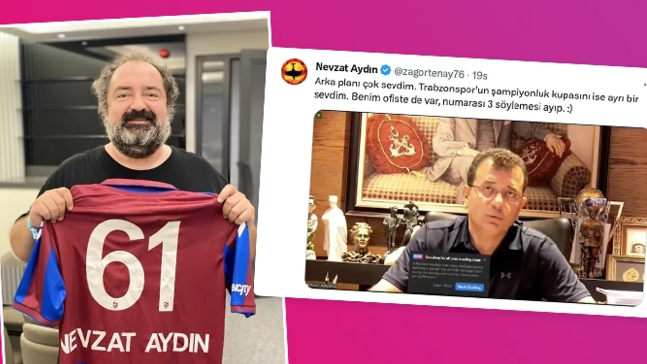 Geçtiğimiz günlerde, Nevzat Aydın'ın Ekrem İmamoğlu'nun zoom toplantısında arka planda gözüken Trabzonspor kupasının minyatürünü sosyal medya hesabından paylaşması dikkatleri çekti. Yaptığı paylaşımda "Arka planı çok sevdim. Trabzonspor'un şampiyonluk kupasını ise ayrı bir sevdim. Benim ofiste de var, numarası 3 söylemesi ayıp. :)" şeklinde esprili bir ifade kullandı.