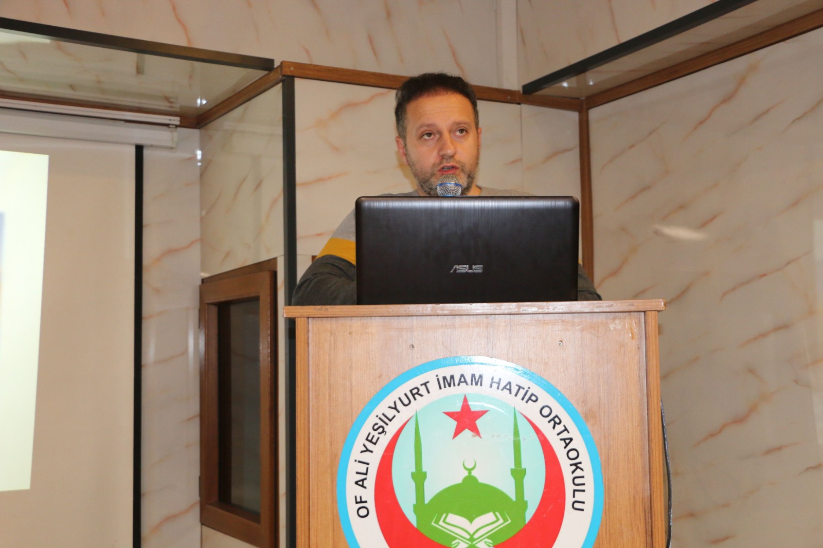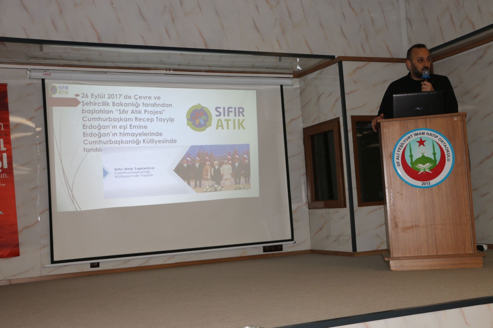 Ali Yeşilyurt İmam Hatip Ortaokulu toplantı salonundaki toplantıya katılan İlçe Şube Müdürü Orhan Topal bir açılış konuşması yaptı. İlçe Milli Eğitim Şube Müdürü Topal konuşmasında;” 2017 yılında Sayın Cumhurbaşkanımızın kıymetli eşleri Emine Erdoğan hanımefendinin öncülüğünde doğal kaynaklarımızın ve ekosistemin korunup geliştirilmesi, gelecek nesiller için sağlıklı ve yaşanabilir bir çevre oluşturulmasını sağlamak üzere üretim ve tüketim süreçlerinde atık oluşumunun önlenmesi azaltılması ayrıştırılması toplanması yeniden kullanımı geri kazanımı bu konuda eğitim bilinçlendirme ve farkındalık sağlanmasına yönelik aşamaları içeren sıfır atık yönetim sistemi toplantımıza hoş geldiniz.Hızla sanayileşen ve doğal kaynakları tünmekte olan dünyamızda insanlığın geleceği için“Sıfır Atık” meselesi çok önem arz ediyor. Toplantımıza Çaykara, Dernekpazarı, Hayrat, Köprübaşı ve Of ilçemizde görevi idareciler katılıyor. Toplantını verimli geçmesini temenni ediyor, başarılar diliyorum.