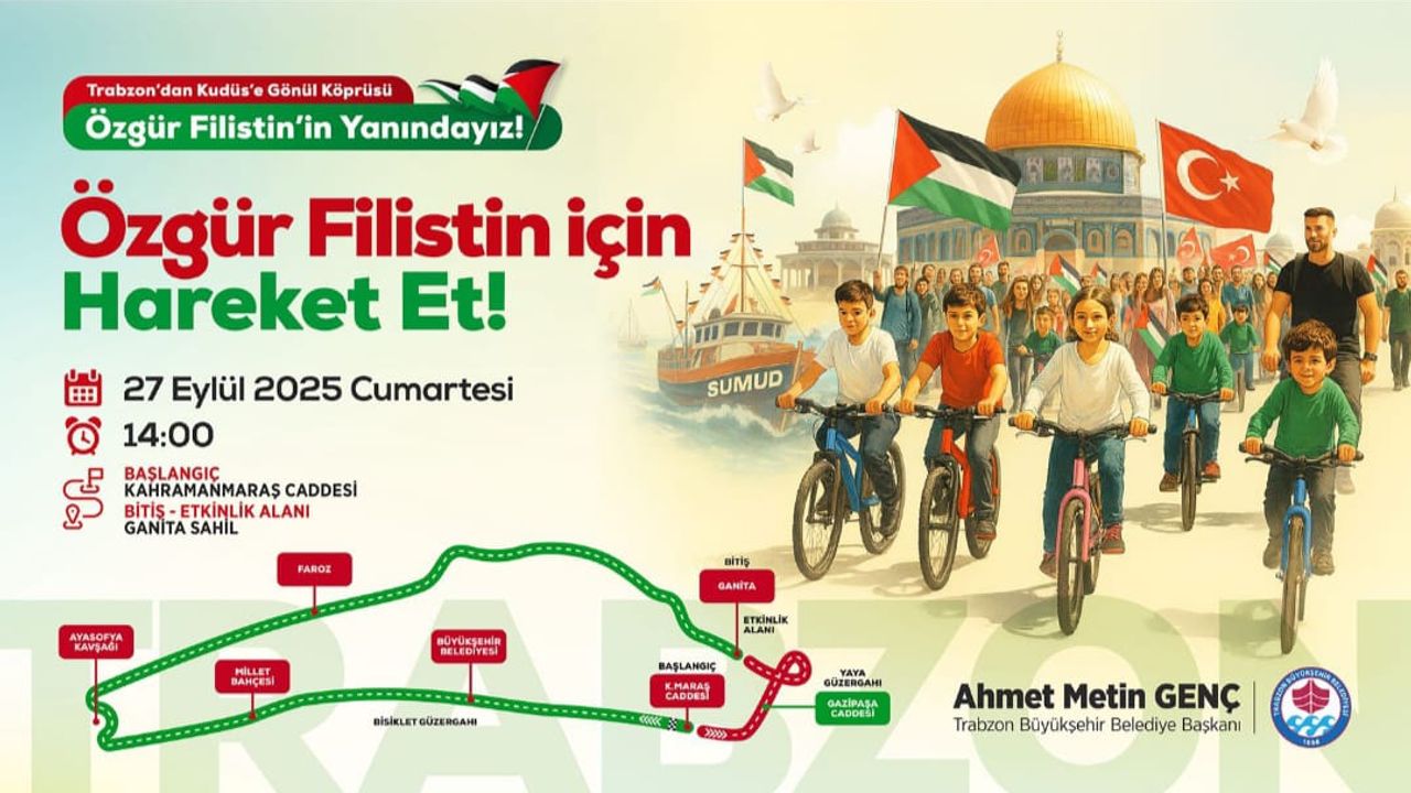 Trabzon Büyükşehir Belediyesi’nin öncülüğünde gerçekleştirilecek “Özgür Filistin için Hareket Et!” etkinliği, saat 14.00’te Kahramanmaraş Caddesi’nden başlayacak. Katılımcılar, Ayasofya Kavşağı, Millet Bahçesi, Büyükşehir Belediyesi ve Faroz güzergâhını izleyerek Ganita Sahili’nde sona erecek bisiklet turuyla Filistin halkına destek mesajı verecek.