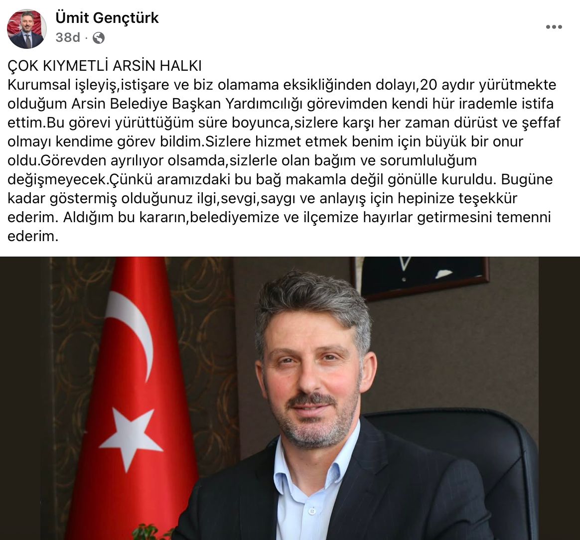 Arsin Belediyesi'nde Belediye Başkan Yardımcısı olarak görev yapan Ümit Gençtürk, görevinden istifa ettiğini duyurdu.