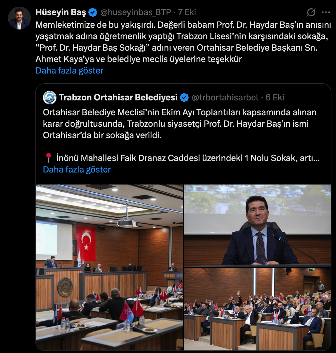 Paylaşımında ise, “Memleketimize de bu yakışırdı. Değerli babam Prof. Dr. Haydar Baş’ın anısını yaşatmak adına öğretmenlik yaptığı Trabzon Lisesi’nin karşısındaki sokağa, “Prof. Dr. Haydar Baş Sokağı” adını veren Ortahisar Belediye Başkanı Sn. Ahmet Kaya’ya ve belediye meclis üyelerine teşekkür ederim" ifadelerine yer verdi.