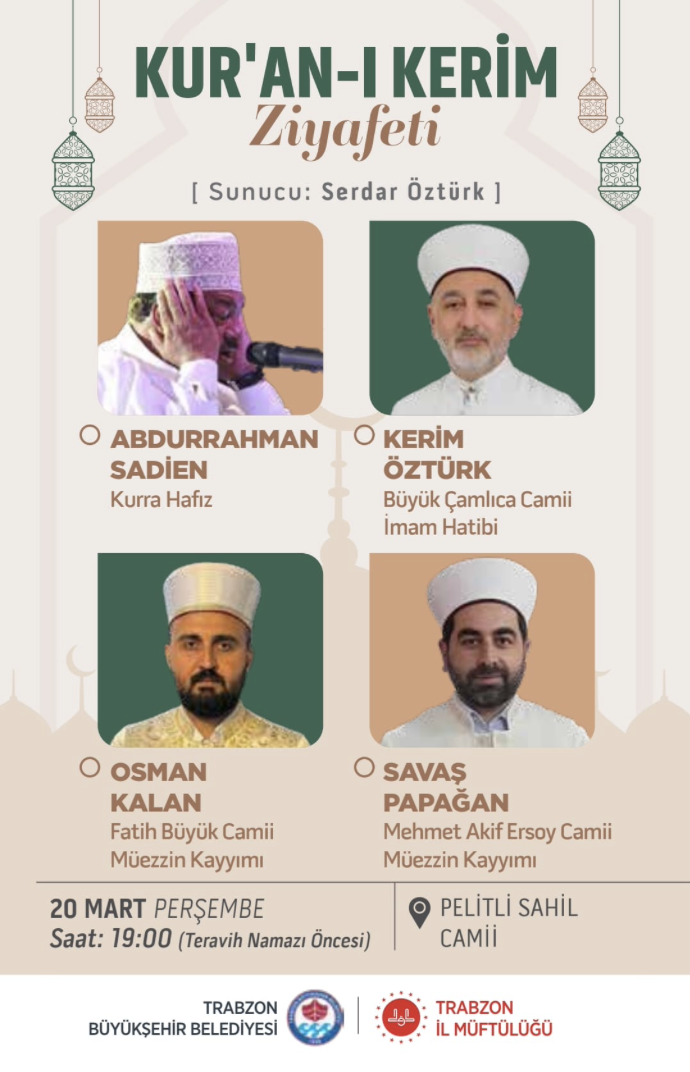 Ramazan ayı boyunca farklı camilerde vatandaşlara Kur’an-ı Kerim ziyafetleri sunulacak. 13 Mart Perşembe akşamı saat 19.00’da Boztepe Muradiye Camii’nde, Ayasofya-i Kebir Camii Şerifi İmam Hatibi Ferruh Muştuer, Eyüp Sultan Camii İmam Hatibi Beytullah Özdemir, Fatih Büyük Camii Müezzin Kayyımı Osman Kalan ve Çarşı Camii Müezzin Kayyımı Hacı Bayram Parmak ile Kur’an-ı Kerim ziyafeti sunulacak. 20 Mart Perşembe akşamı saat 19.00’da Pelitli Sahil Camii’nde Kurra Hafız Abdurrahman Sadien, Büyük Çamlıca Camii İmam Hatibi Kerim Öztürk, Fatih Büyük Camii Müezzin Kayyımı Osman Kalan ve Mehmet Akif Ersoy Camii Müezzin Kayyımı Savaş Papağan’ın katılacağı program düzenlenecek. 26 Mart Çarşamba akşamı saat 19.00’da Bahçecik Mehmet Akif Ersoy Camii’nde, Mecidiyeköy Merkez Camii Baş İmam Hatibi Ali Derman, Beyazıt Camii İmam Hatibi Mehmet Duman, Fatih Büyük Camii Müezzin Kayyımı Osman Kalan ve Çarşı Camii Müezzin Kayyımı Hacı Bayram Parmak Kur’an ziyafeti sunacak. 27 Mart Perşembe akşamı saat 19.00’da Akçaabat Söğütlü Ulu Camii’nde, Ayasofya-i Kebir Cami-i Şerifi İmam Hatibi Bünyamin Topçuoğlu, Büyük Çamlıca Camii Müezzini Enes Özsoy, Fatih Büyük Camii Müezzin Kayyımı Osman Kalan ve Mehmet Akif Ersoy Camii Müezzin Kayyımı Savaş Papağan’ın katılacağı program düzenlenecek.