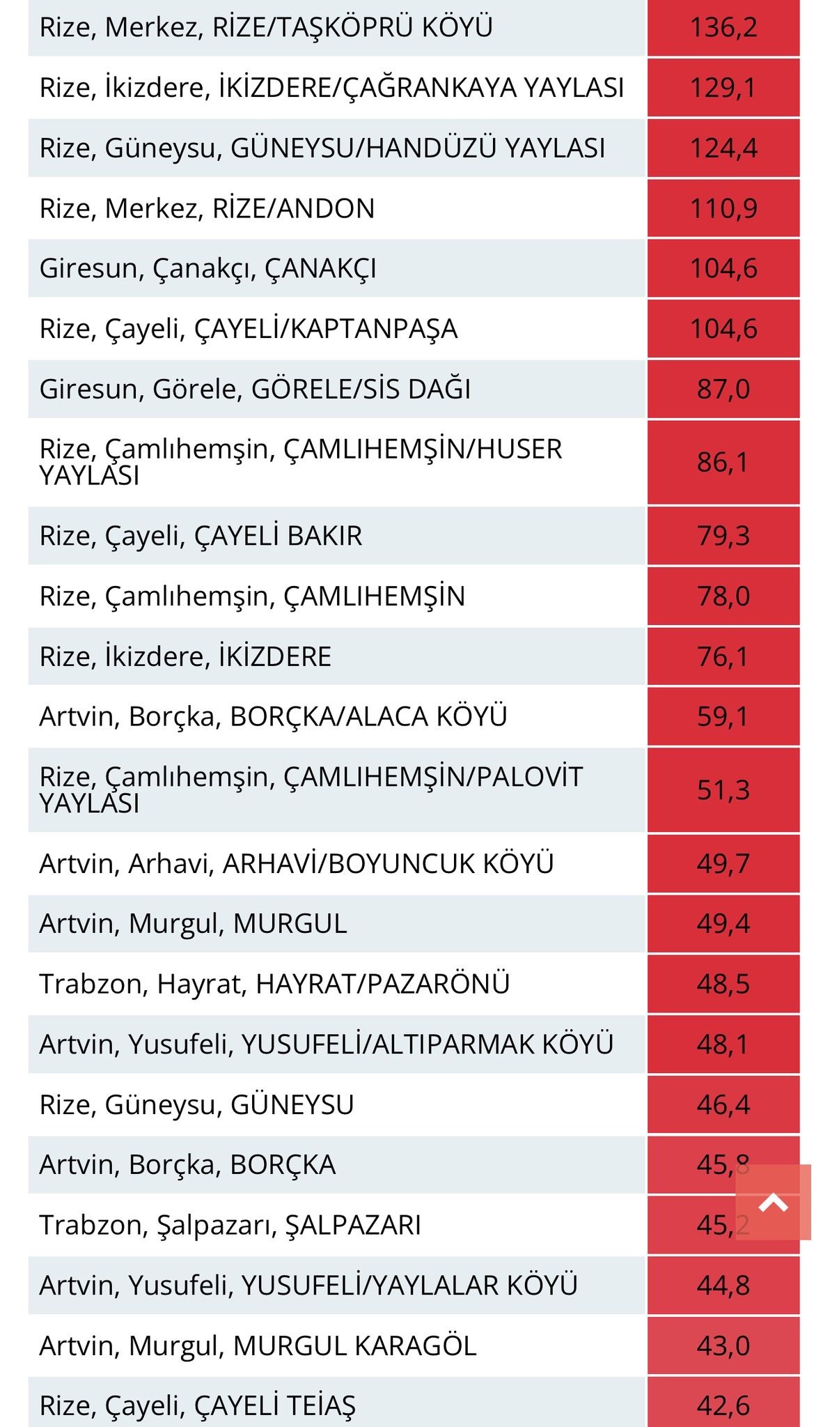 Rize İl Afet ve Acil Durum Müdürlüğü'nden alınan bilgiye göre, Rize'nin bir çok noktasına son 24 saatte 110 kg ve üstü yağış düşerken, en fazla yağış Rize merkeze bağlı Taşköprü'ye 136,2 kg olarak düştü. Taşköprü'yü İkizdere ilçesinin Çağrankaya Yaylası 129 kg, Güneysu Handüzü Yaylası 124,4 kg ve Rize-Andon 110,9 kg ile izledi.