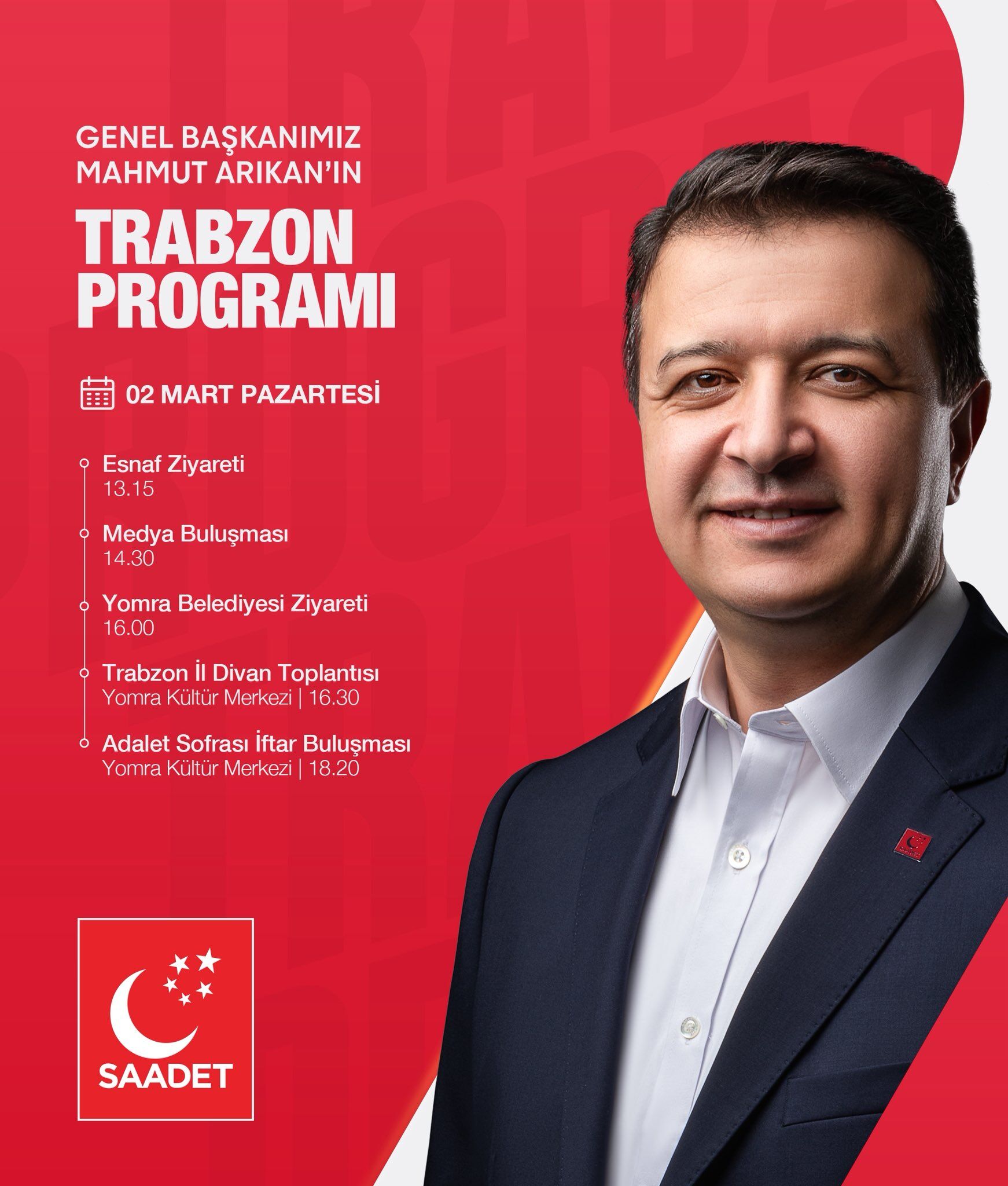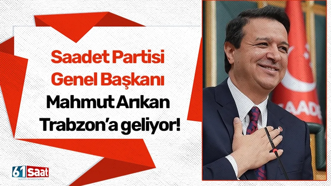 Saadet Partisi Genel Başkanı Mahmut Arıkan, 2 Mart Pazartesi günü Trabzon’da çeşitli ziyaret ve toplantılar gerçekleştirecek. Program kapsamında hem teşkilat mensuplarıyla hem de vatandaşlarla bir araya gelecek.