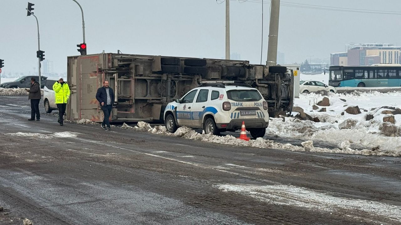 Edinilen bilgilere göre, ilçenin Talaytepe Mahallesi Sultan Sasa Bulvarı'nda seyir halindeki tır, kayganlaşan yolda sürücüsünün direksiyon hakimiyetini kaybetmesi sonucu devrildi. İhbar üzerine olay yerine polis ve sağlık ekibi sevk edildi. Sürücü, sağlık ekiplerinin ilk müdahalesinin ardından hastaneye sevk edildi.