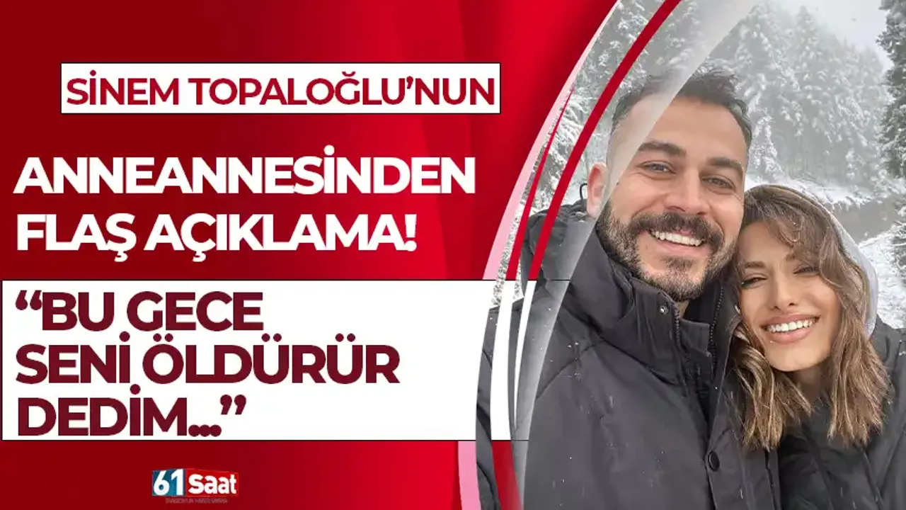Trabzon'da boşanma aşamasındaki eşi Ali Somun (30) tarafından tabancayla vurularak öldürülen gemi kaptanı adayı Sinem Topaloğlu'nun (27), olaydan 2 saat önce restoranda yemek yerken çekilen son fotoğrafını anneannesi Gülnaz Topaloğlu’na gönderdiği ortaya çıktı. Torunuyla son görüşmesini anlatan Topaloğlu, “Telefonda konuştuk. Bana, ‘Ali Eren eve girer, arkamdan gelir diye korktum. Yemek yemek için lokantaya geldim. Boşanma dilekçem eline geçti. Ölümüm onun elindense ne yapayım? Adacık Mahallesi’nden gelirse ölüm gelir. Bu gece rahat bir uyku uyu, bende gidip rahat bir uyku çekeceğim’ dedi. Ben de ‘Dilekçen onun eline geçtiyse o seni bu gece öldürür, ben seni Ali Eren öldürsün diye mi büyüttüm? Kendine dikkat et, arkadaşlarınla eve git’ dedim” diye konuştu.