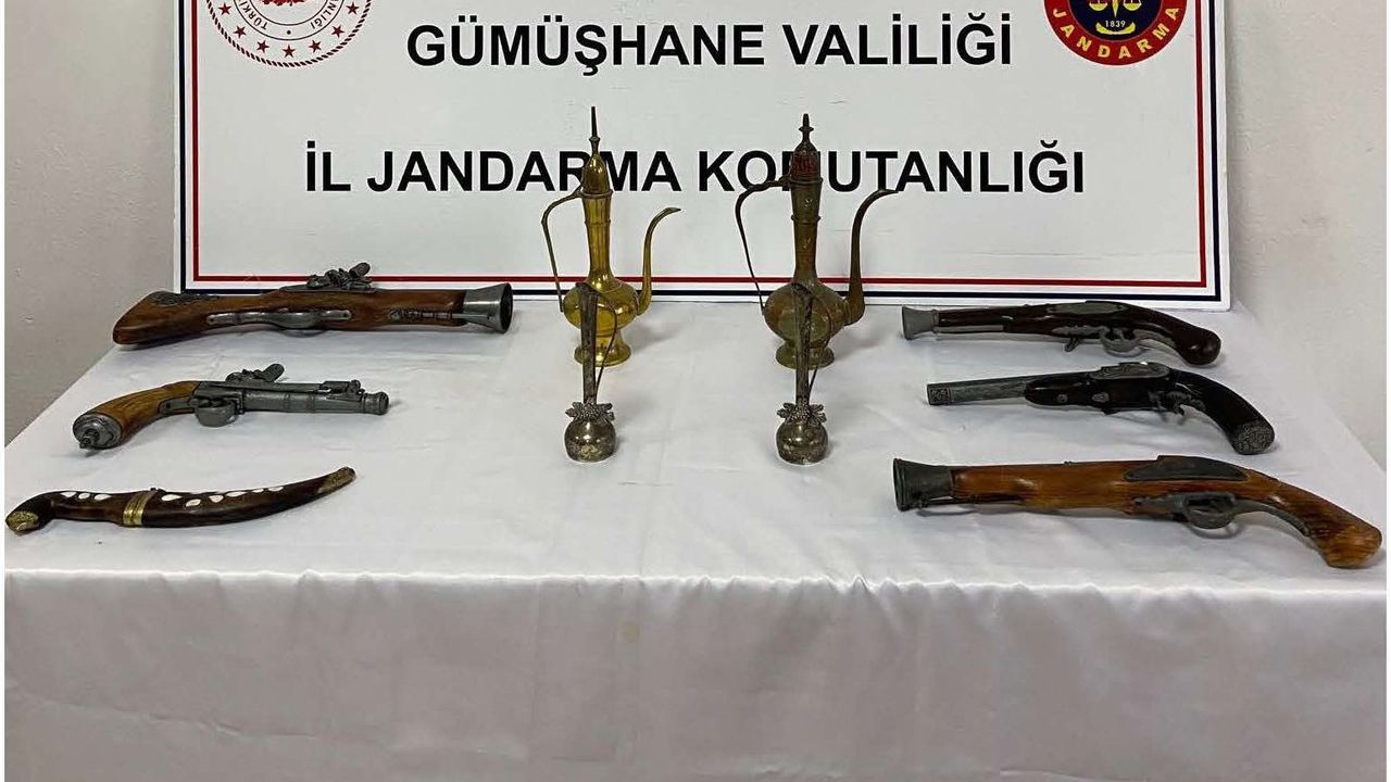 Gümüşhane Sulh Ceza Hakimliğinden alınan arama kararına istinaden şahsın ev ve eklentilerinde yapılan arama sonucunda 5 adet antika olduğu değerlendirilen dolma çakmaklı piştov tabanca ve 4 adet tarihi eser olduğu değerlendirilen ibrik ele geçirildi.