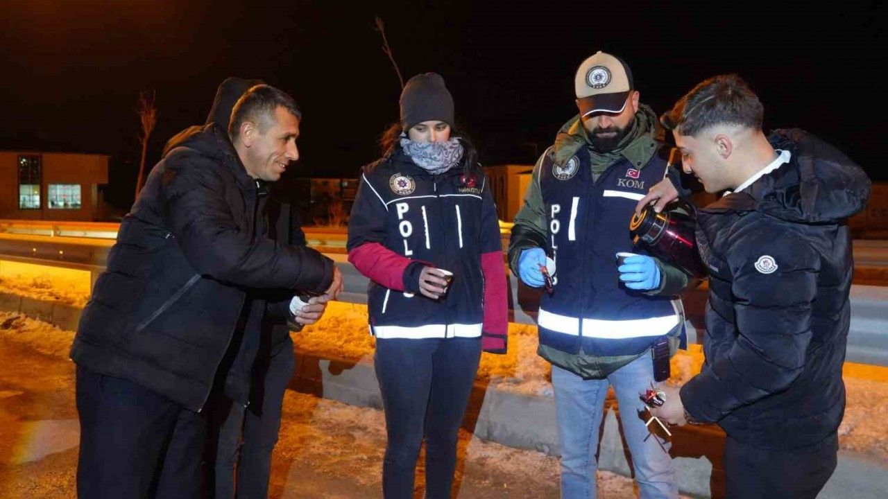 Dondurucu soğukların yaşandığı, kış mevsiminin çetin geçtiği Bayburt’ta gece saatlerinde gerçekleştirilen trafik denetiminde, polis ekipleri soğuk havada seyahat eden vatandaşlara çay ve kurabiye ikram ederek, iç ısıtan bir jest yaptı.