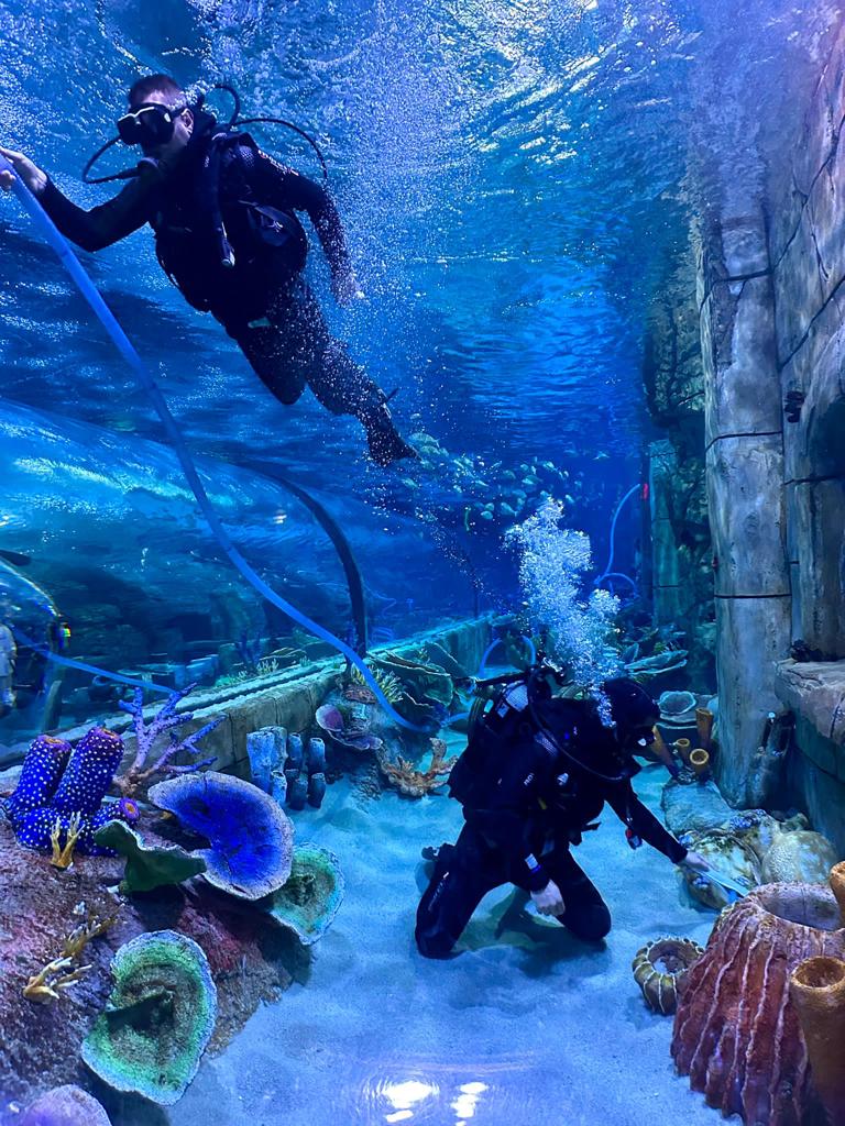 Akvaryum temizliği dalgıçlar tarafından yapılıyor.