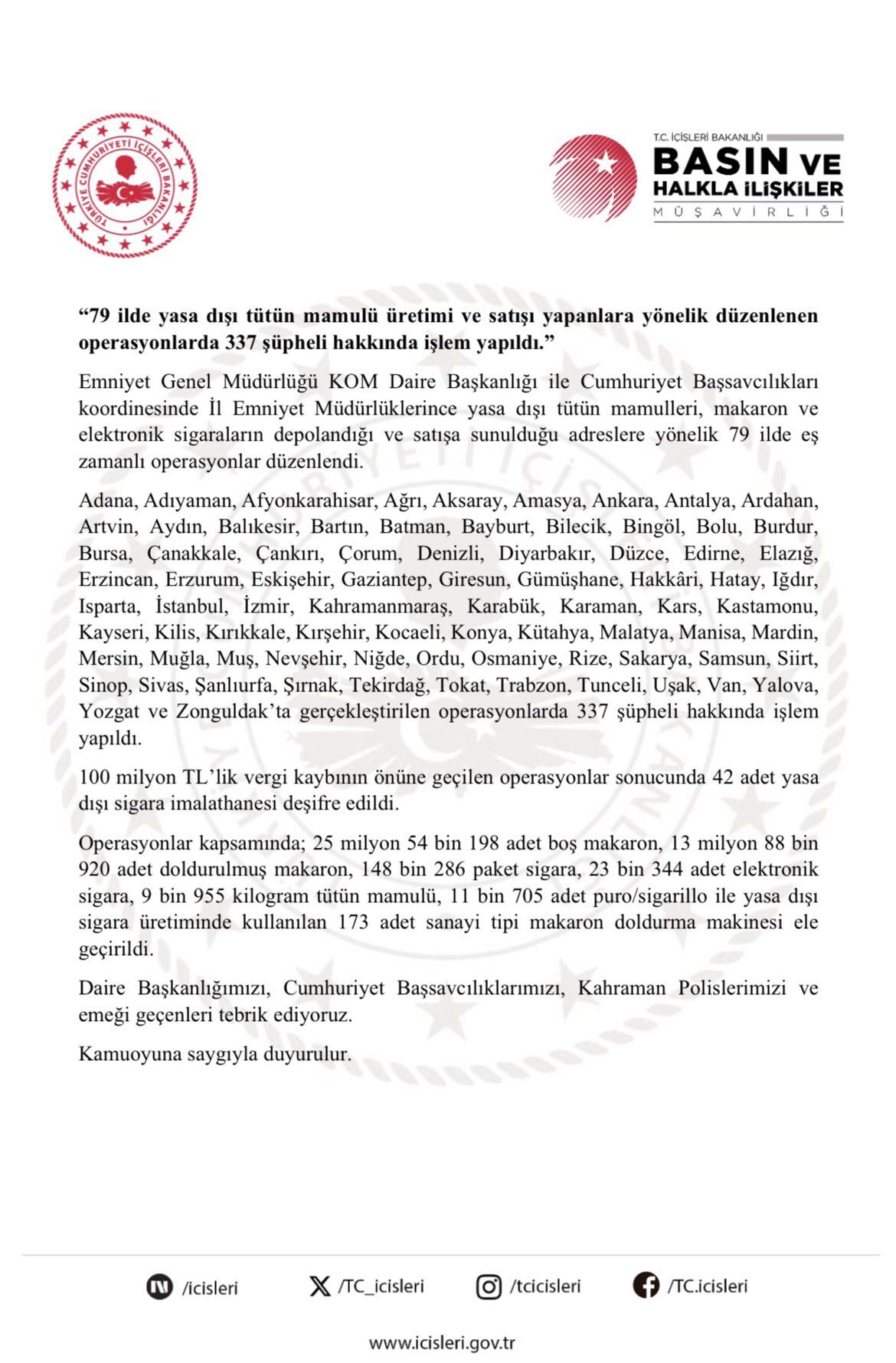 Operasyonlarda 337 şüpheli hakkında işlem yapılırken, yasa dışı üretim ve satışın gerçekleştirildiği çok sayıda adres deşifre edildi. Yapılan çalışmalarla yaklaşık 100 milyon TL’lik vergi kaybının önüne geçildiği bildirildi.