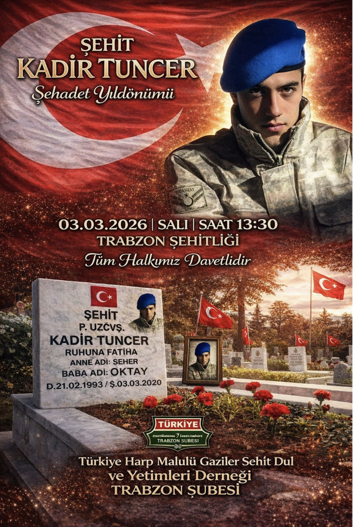Trabzonlu Şehit Piyade Uzman Çavuş Kadir Tuncer, şehadetinin yıl dönümünde dualarla anılacak. Türkiye Harp Malulü Gaziler, Şehit Dul ve Yetimleri Derneği Trabzon Şubesi tarafından düzenlenecek anma programı, bugün saat 13.30’da Trabzon Şehitliği’nde gerçekleştirilecek.