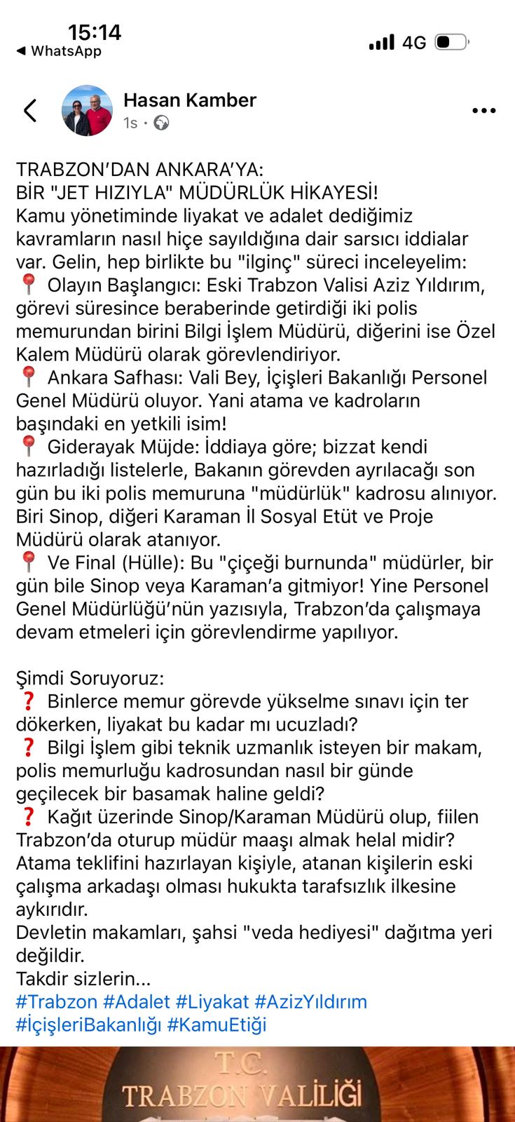 Trabzon Valiliği eski Özel Kalem Müdürü Hasan Kamber sosyal medya hesabından yaptığı paylaşımda, “Trabzon’dan Ankara’ya bir jet hızıyla müdürlük hikayesi” başlığı ile dikkat çeken iddialarda bulundu.