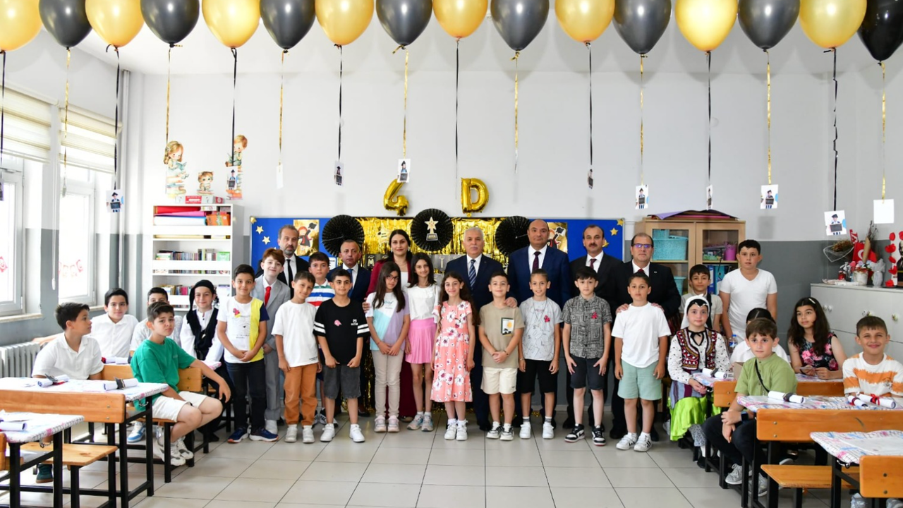 Sınıfları gezerek öğrencilerle birebir ilgilenen Vali Yıldırım, karne ve başarı belgelerini takdim ederek çocuklara yaz tatili için iyi dileklerde bulundu.