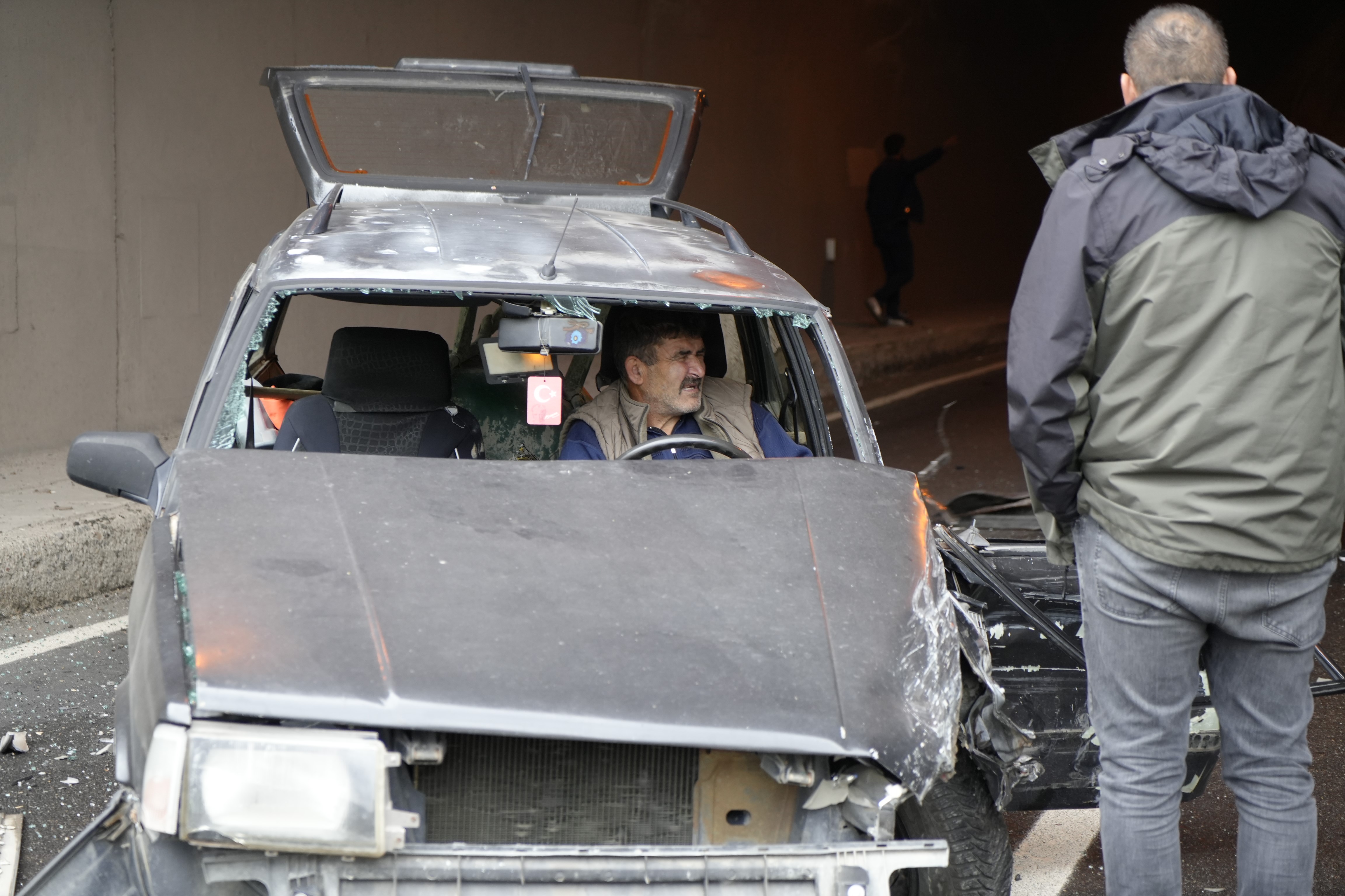 Öte yandan 61 ND ... plakalı otomobilin sürücüsü H.Y.’nin araç içerisinde sağlık ekiplerini beklediği ve telefonla yakınlarını arayarak kazayı haber verdiği anlar kaydedildi.