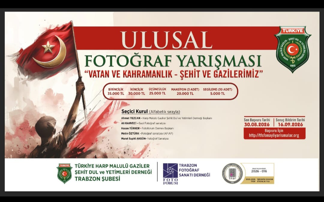 Türkiye Harp Malulü Gaziler Şehit Dul ve Yetimleri Derneği Trabzon Şubesi’nin, Trabzon Fotoğraf Sanatı Derneği iş birliğiyle düzenlediği Ulusal Fotoğraf Yarışması için başvurular başladı. “Vatan ve Kahramanlık - Şehit ve Gazilerimiz” temalı yarışma, katılımcılardan vatan sevgisi, fedakârlık ve kahramanlık duygularını yansıtan kareler bekliyor.