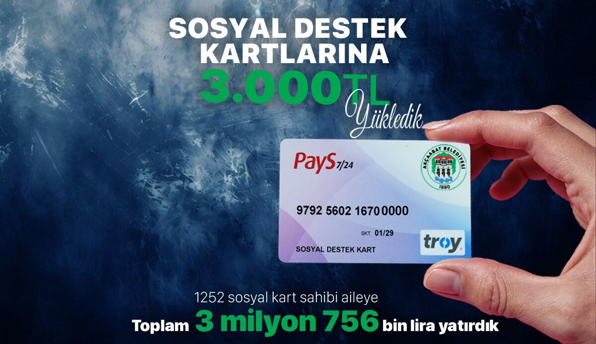 Akçaabat Belediyesi, sosyal belediyecilik anlayışıyla ihtiyaç sahibi vatandaşların yanında olmaya devam ediyor. Belediye tarafından yürütülen sosyal destek çalışmaları kapsamında Sosyal Destek Kartı sahibi 1252 ailenin kartına 3 bin TL yükleme yapılarak toplam 3 milyon 756 bin TL destek sağlandı.