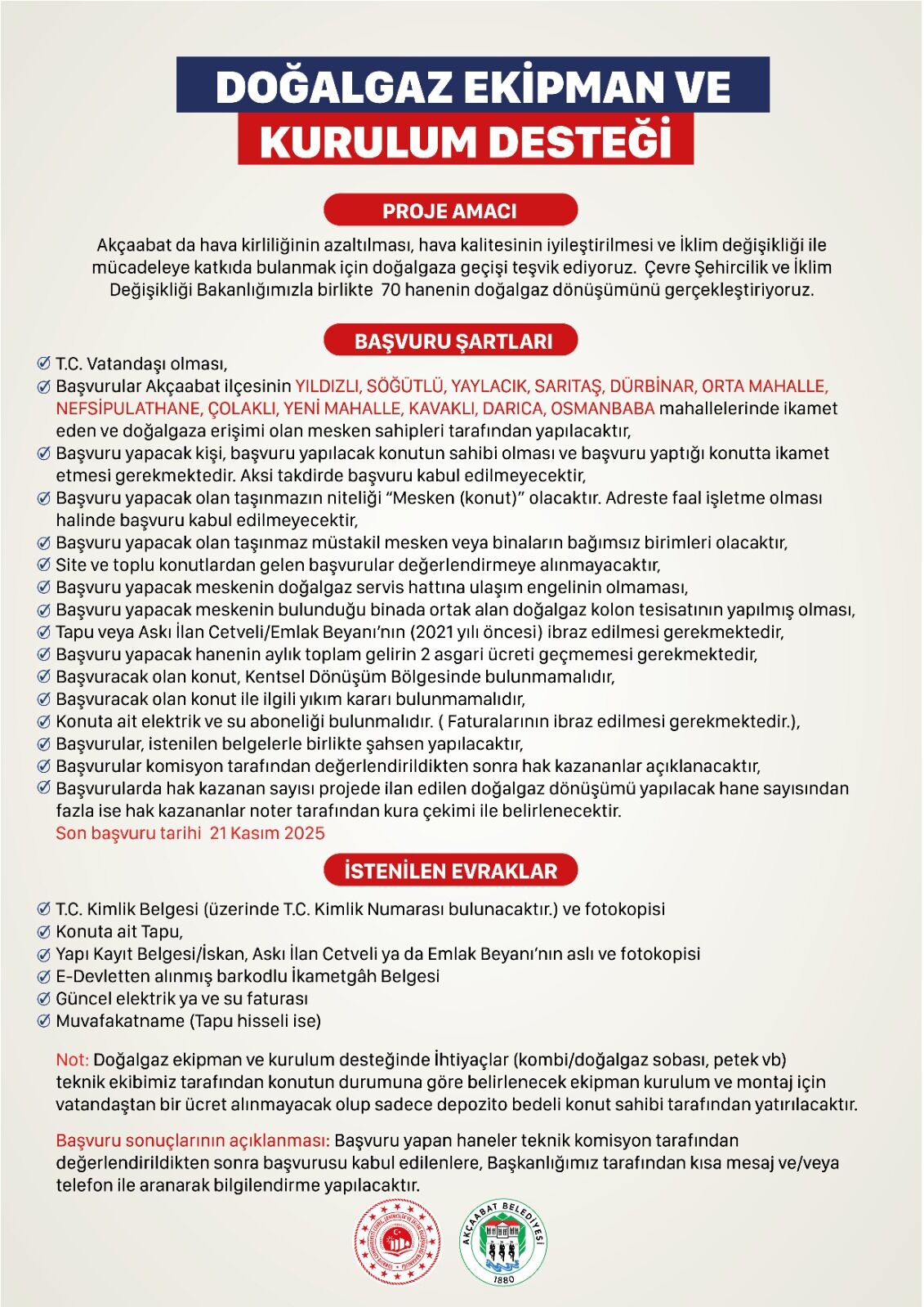 Projeden yararlanmak isteyen vatandaşların T.C. vatandaşı olması, Akçaabat’ın Yıldızlı, Söğütlü, Yaylacık, Sarıtaş, Dürbinar, Orta Mahalle, Nefsipulathane, Çolaklı, Yeni Mahalle, Kavaklı, Darıca ve Osmanbaba mahallelerinden birinde ikamet etmeleri gerekiyor.