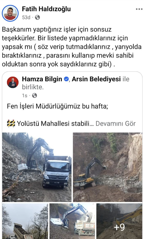 Söz konusu paylaşımın yapıldığı süreçte Arsin Belediyesi tarafından Yolüstü Mahallesi’nde stabilize yol çalışmaları yürütüldü. Belediye, iş makineleri, kamyonlar ve sahadaki faaliyetlere ilişkin görselleri kamuoyuyla paylaştı.