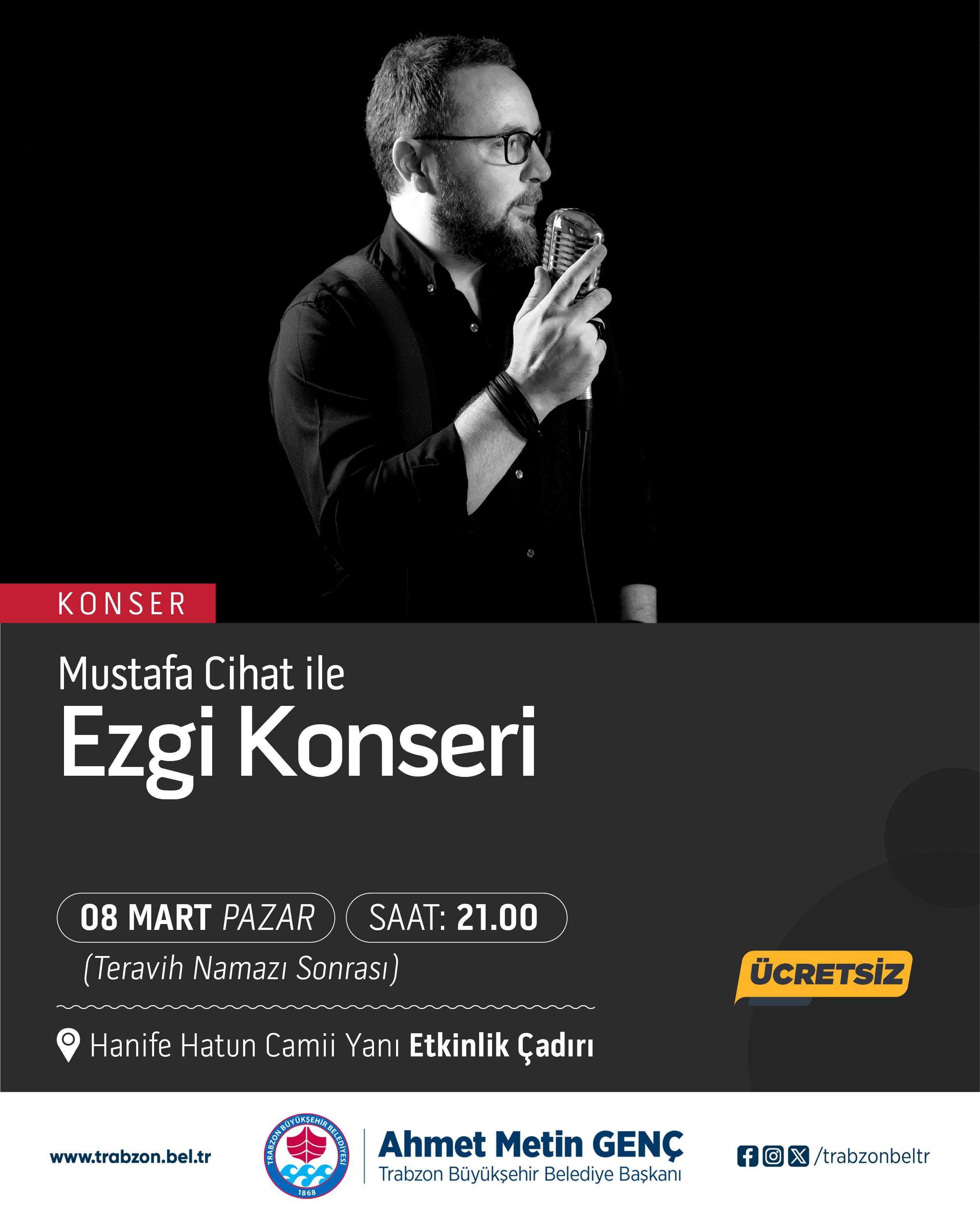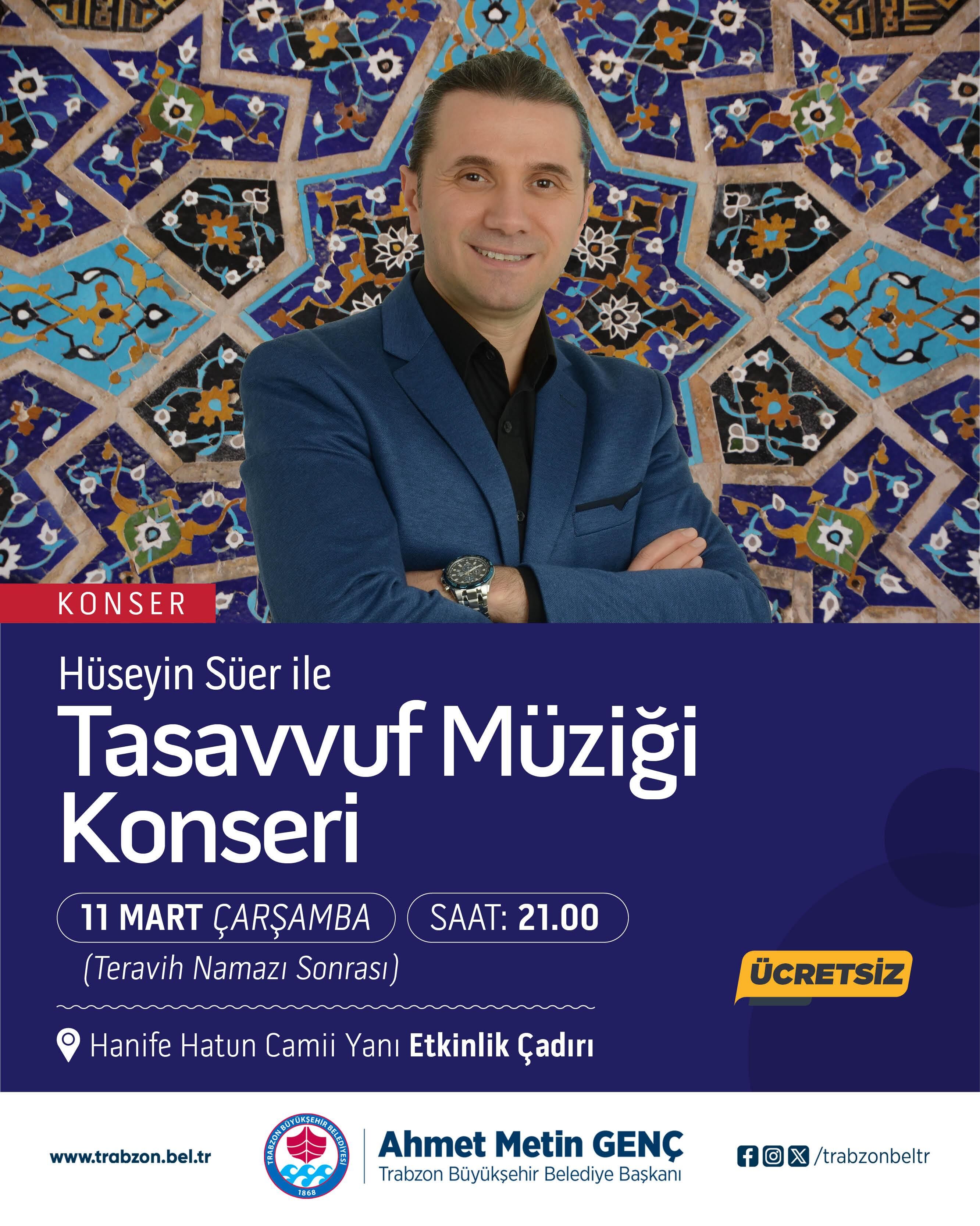Ramazan etkinliklerinin önemli bölümünü tasavvuf müziği konserleri oluşturuyor. Program kapsamında 10 Mart Salı günü saat 21.00’de sanatçı Mustafa Fidan tasavvuf müziği konseri ile sahne alacak. 11 Mart Çarşamba günü ise sanatçı Hüseyin Sürer Trabzonlularla buluşacak. Etkinlikler 13 Mart Cuma günü gerçekleştirilecek programla devam edecek. Bu kapsamda Murat Burçin Derinç ile İzmir Tasavvuf ve Klasik Türk Müziği Topluluğu sahne alacak.