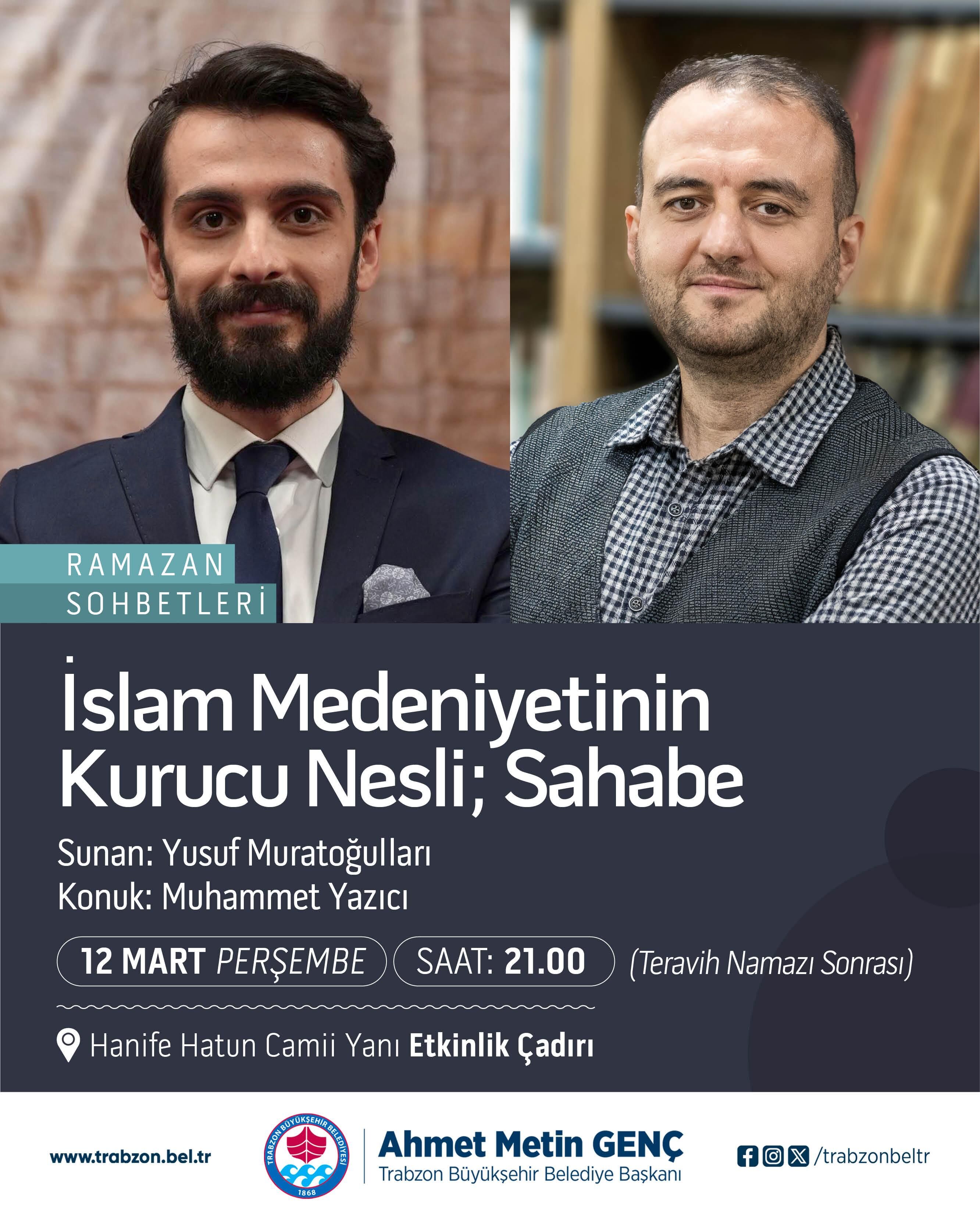 Ramazan ayının manevi atmosferine uygun olarak düzenlenen sohbet programları da vatandaşlarla buluşuyor. Bu kapsamda 9 Mart Pazartesi günü gerçekleştirilecek Ramazan sohbetlerinde “Türkiye’nin Kalkınmasında Gençlerin Rolü” konusu ele alınacak. Moderatörlüğünü Yusuf Muratoğulları’nın yapacağı programın konuğu Karadeniz Teknik Üniversitesi Rektörü Prof. Dr. Hamdullah Çuvalcı olacak. 12 Mart Perşembe günü düzenlenecek söyleşide ise Muhammet Yazıcı, “İslam Medeniyetinin Kurucu Nesli: Sahabe” konusunu anlatacak.