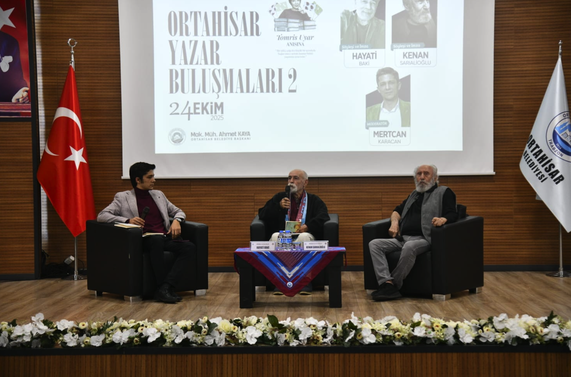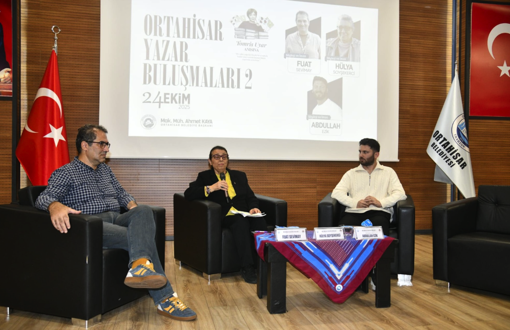 Program, Yazarlar Güven Baykan, İbrahim Dizman ve İlyas Tunç’un Psikolog-Yazar Melih Yıldız’ın moderatörlüğünde gerçekleşen söyleşi ile devam etti. Karadeniz bölgesi ve edebiyat üzerine konuşmaların gerçekleştiği söyleşide Yazar Dizman, geçtiğimiz yıllarda hayatını kaybeden Trabzonlu şair Özer Ciravoğlu’nun yazarlık serüvenindeki etkilerini anlattı. Tunç, bölge üzerine yazdığı kitaplardan bahsederken Baykan ise Trabzon’un sanatsal anlamda ifade ediş şekli üzerine değerlendirmelerde yaptı. Söyleşinin ardından konuklara plaket ve hediyelerini Ortahisar Belediye Başkan Yardımcısı Özer İskender ve Meclis Üyesi Arzu Öktem sundu.