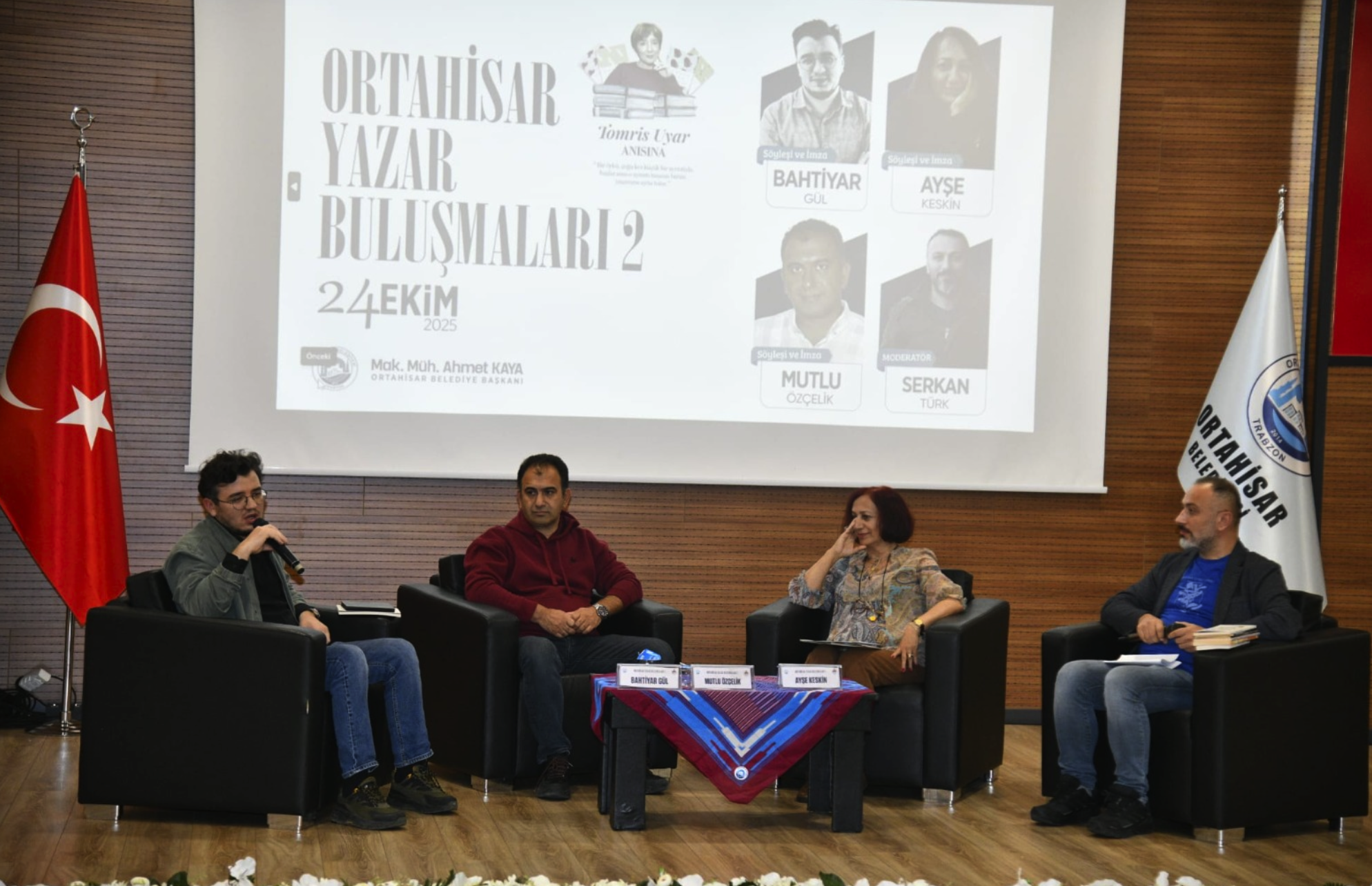Yoğun bir tempo ile süren etkinlikler, Yazarlar Ayşe Keskin, Mutlu Özçelik ve Bahtiyar Gül’ün moderatör Serkan Türk’le gerçekleştirdiği söyleşi ile sürdü. ‘Trabzon’da yazmak ve yaşamak’ konusunda konuşan yazarlar, yazarlık serüvenlerinin gelişimini anlattı. Konuklar, eserleri ve yazım süreçleriyle ilgili Türk’ün sorularını cevaplandırdılar. Büyük bir keyifle geçen söyleşinin ardından konuklara CHP eski Trabzon İl Başkanı Güzide Uzun, CHP Trabzon İl Kadın Kolları Başkanı Zerin Yavuz, Ortahisar Belediye Meclis Üyesi Arzu Öktem plaket ve hediye takdim etti.
