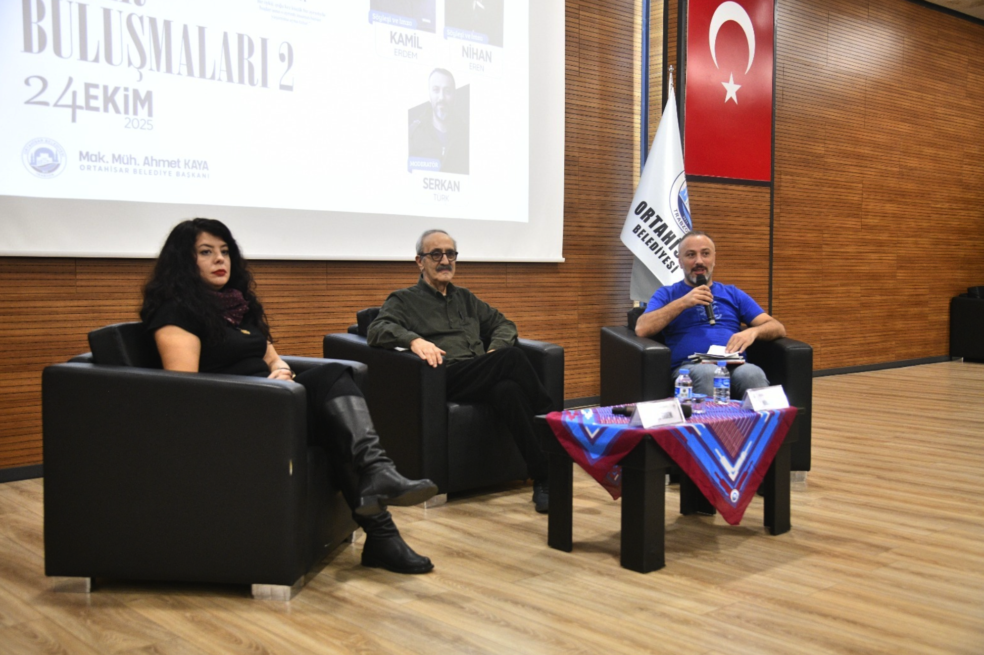 Bir sonraki programda yazar Kamil Erdem ve Yazar-Senarist Nihan Eren, Serkan Türk moderatörlüğünde öykü ve kurmaca metinler üzerine söyleşti. Konuklar kitapları ve yazarlık serüvenleri üzerine Türk’ün sorularını yanıtladı. İlgi çeken söyleşinin ardından konuklara Ortahisar Belediye Meclis Üyesi Olgun Önder plaket ve hediye sundu.
