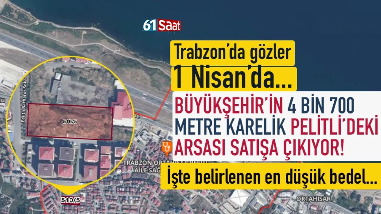 Trabzon Büyükşehir Belediyesi, Pelitli Mahallesi'ndeki 510 ada 5 parsel numaralı konut imarlı arsayı 97,7 milyon TL muhammen bedelle satışa sunuyor. İhale 1 Nisan 2026'da yapılacak.