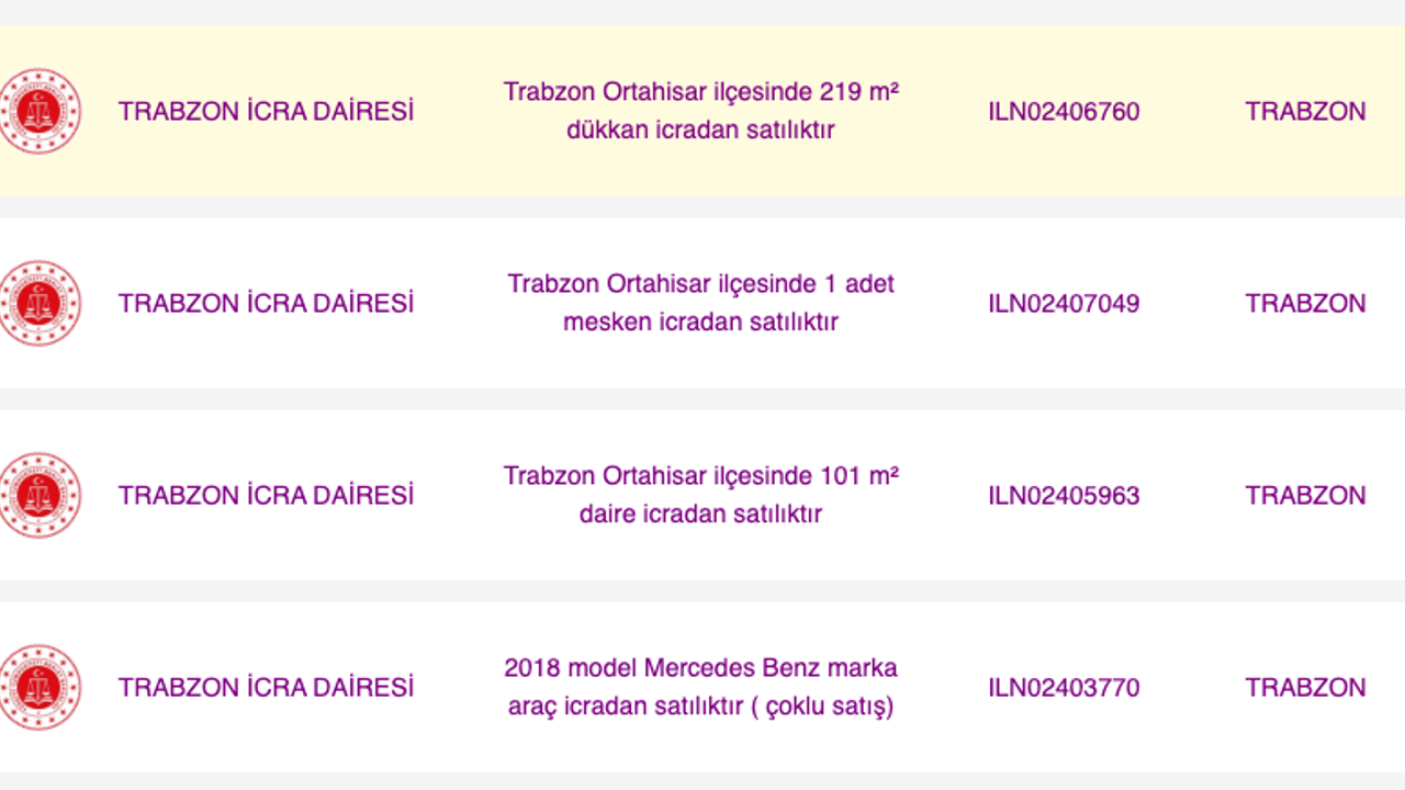 Trabzon İcra Dairesi tarafından farklı dosyalar kapsamında çok sayıda taşınmaz ve taşıtın satışa çıkarıldığı duyuruldu. Satışlar, esatis.uyap.gov.tr üzerinden elektronik ortamda açık artırma usulüyle gerçekleştirilecek.
