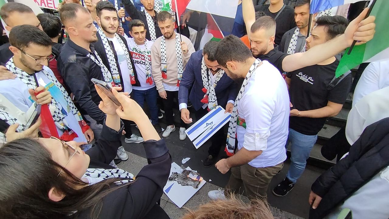 Ellerinde Türkiye Cumhuriyeti ve Filistin bayrakları taşıyan grup, Filistin'e destek, İsrail'e protesto içerikli sloganlar eşliğinde Atatürk Alanı, Meydan Parkına doğru yürüyüş yaptı.